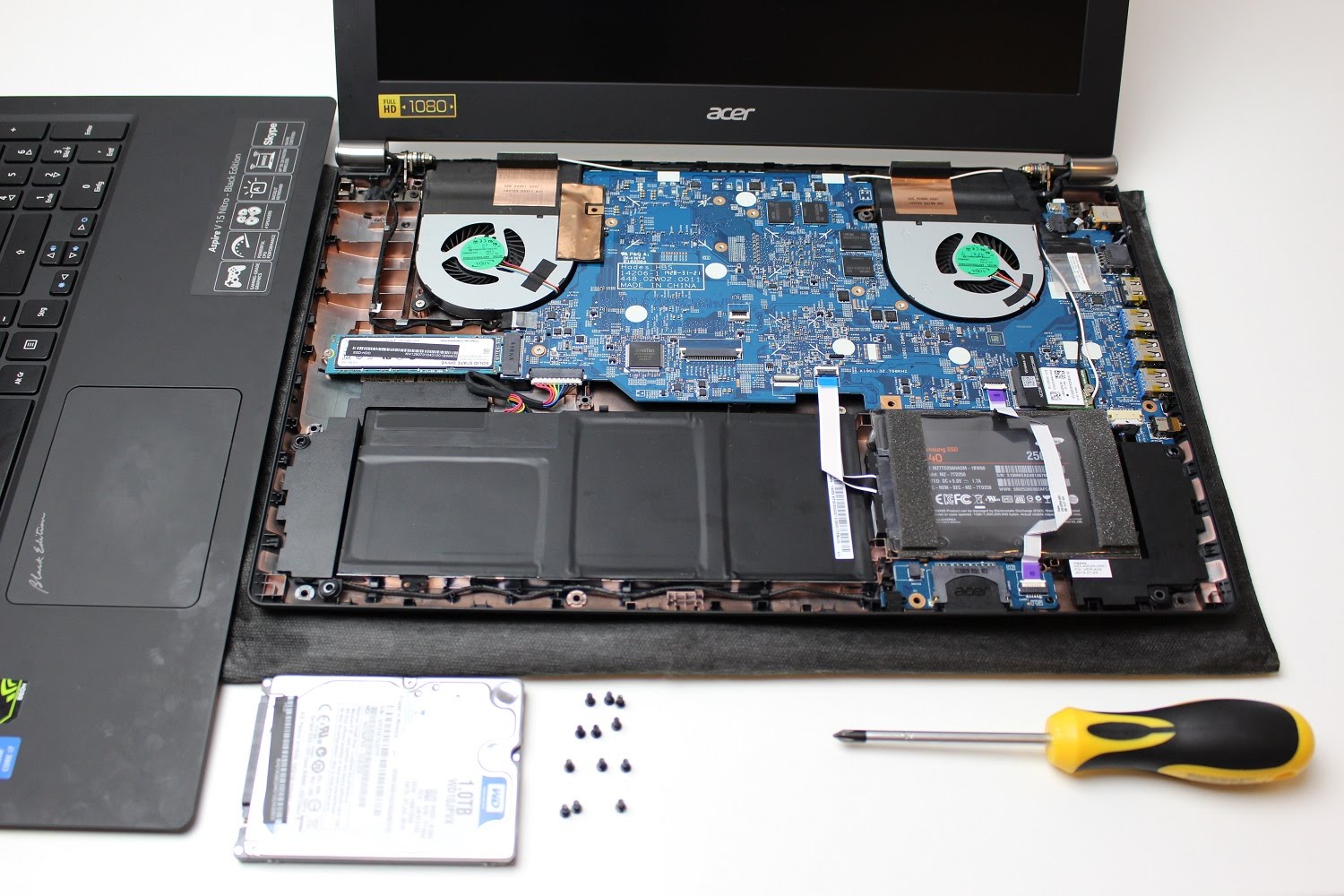 Sajnos a szerelése egy átlagfelhasználónak nehéz. A hátlapi csavarok, majd a billentyűzet eltávolítása után le kell húznunk az LCD panel csatlakozóját is, ezek után férhetünk hozzá a cserélhető alkatrészekhez, mint például a merevlemezhez, az M.2 foglalatú SSD meghajtóhoz és az 52,5 Wh-s akkuhoz. Ez utóbbi nem cserélhető.