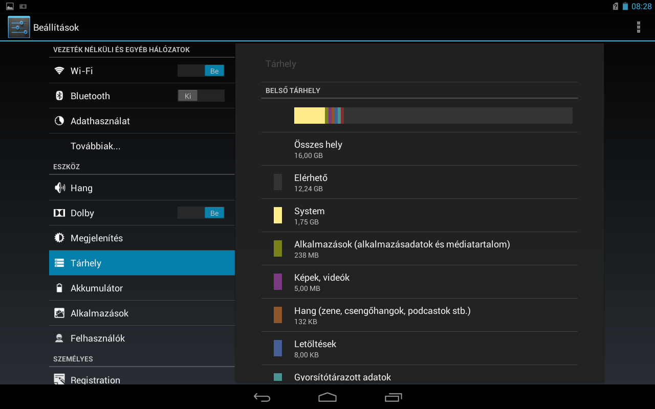 16GB tárhelyünk van, amit még bővíthetünk SD kártyával, 3G kapcsolata megoldott, USB-OTG csatlakozás töltés funkcióval, meg miro-HDMI kijelzőkre csatlakozáshoz.