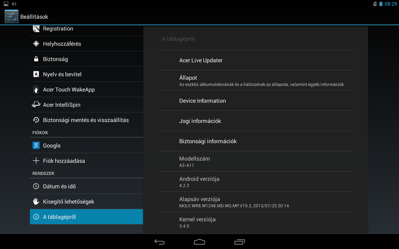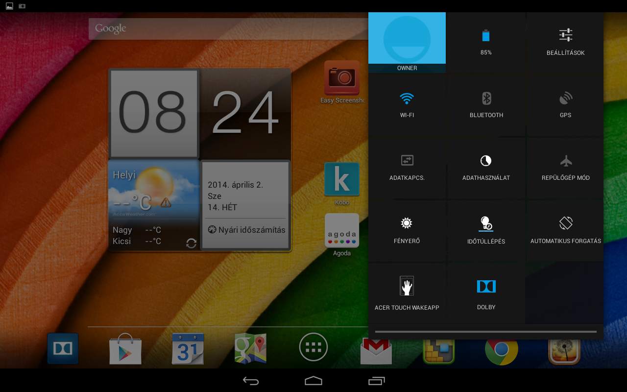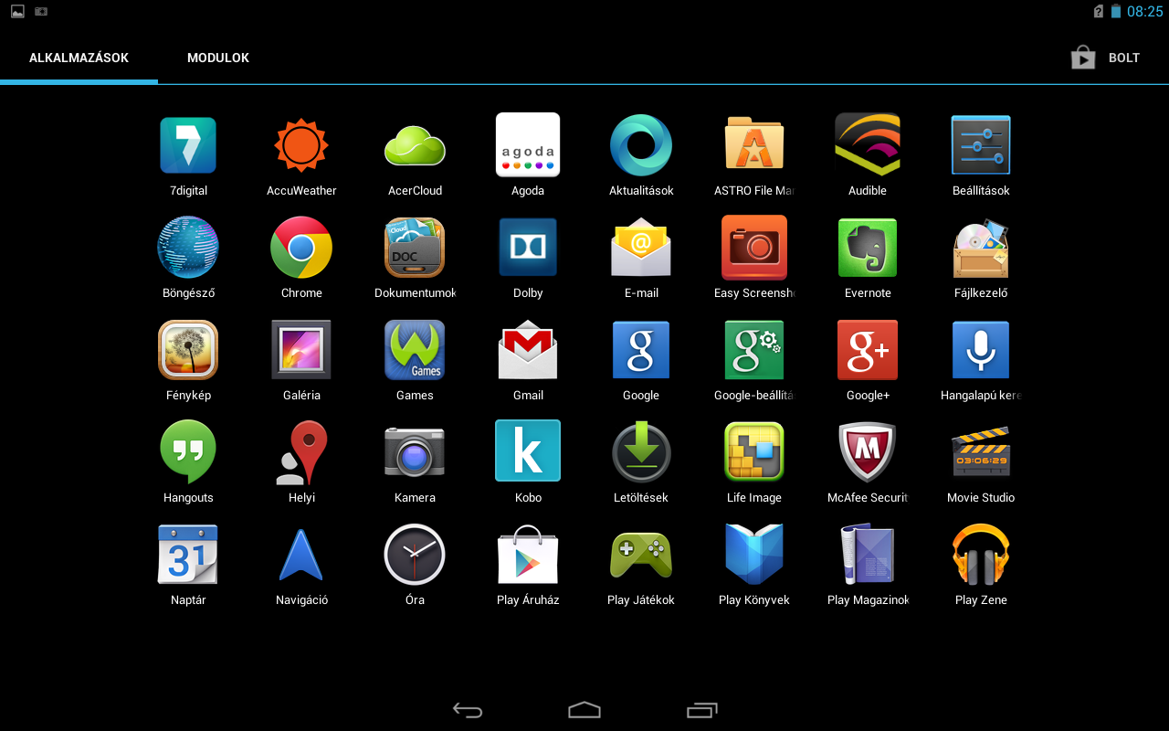 Jelenleg táblagépünkön Android JB 4.2.2 rendszer fut, elég jó teljesítménnyel! Az MT8389W processzor, 1GB memória teszi a dolgát, sőtt van alapból 16GB tárhelyünk, amiből még 12GB körüli tárhely rendelkezésünkre áll! A már szokásos androidos alkalmazásokon kívül pár előtelepített applikációt is kaptunk az Acer-től.