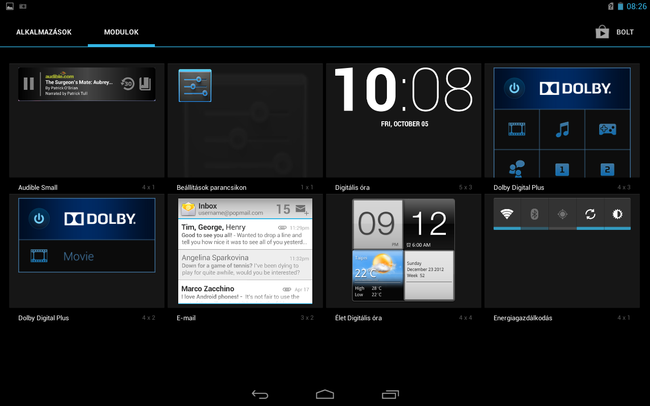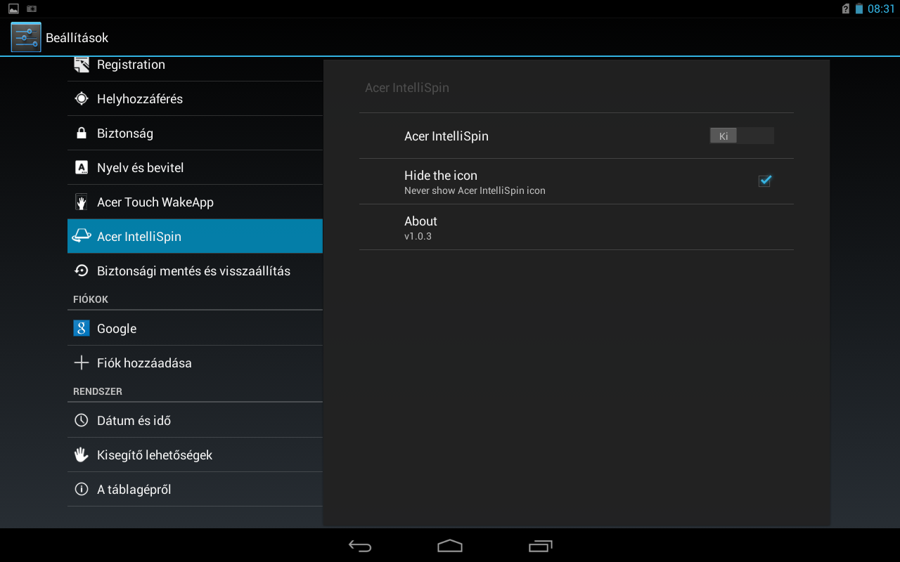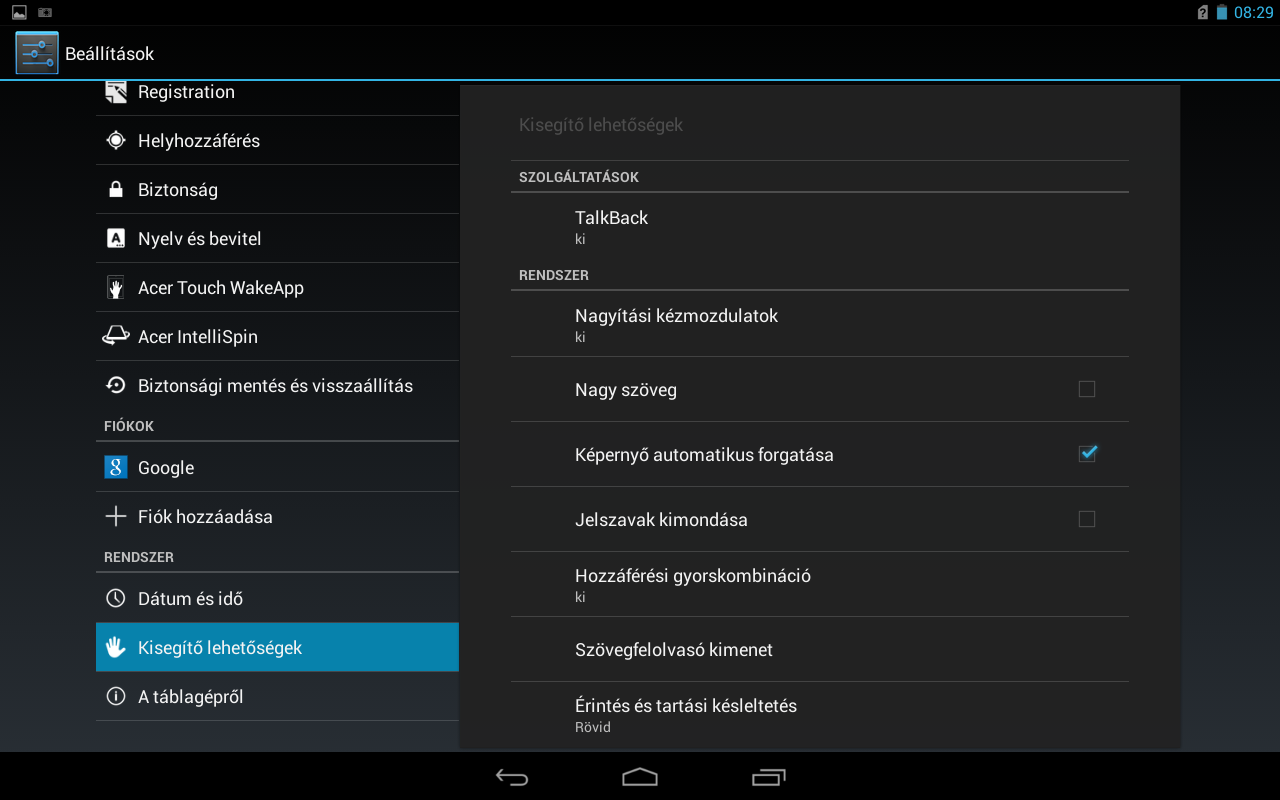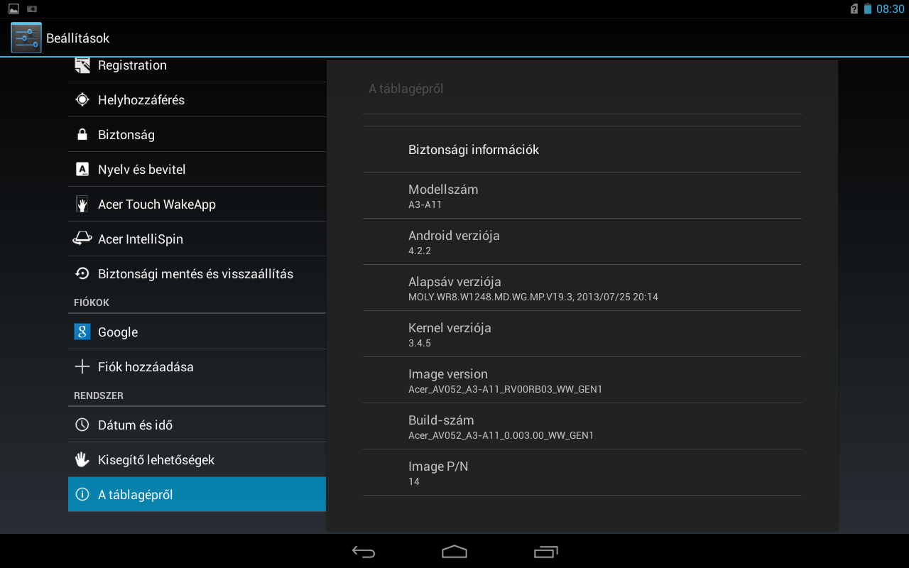 Jelenleg táblagépünkön Android JB 4.2.2 rendszer fut, elég jó teljesítménnyel! Az MT8389W processzor, 1GB memória teszi a dolgát, sőtt van alapból 16GB tárhelyünk, amiből még 12GB körüli tárhely rendelkezésünkre áll! A már szokásos androidos alkalmazásokon kívül pár előtelepített applikációt is kaptunk az Acer-től.