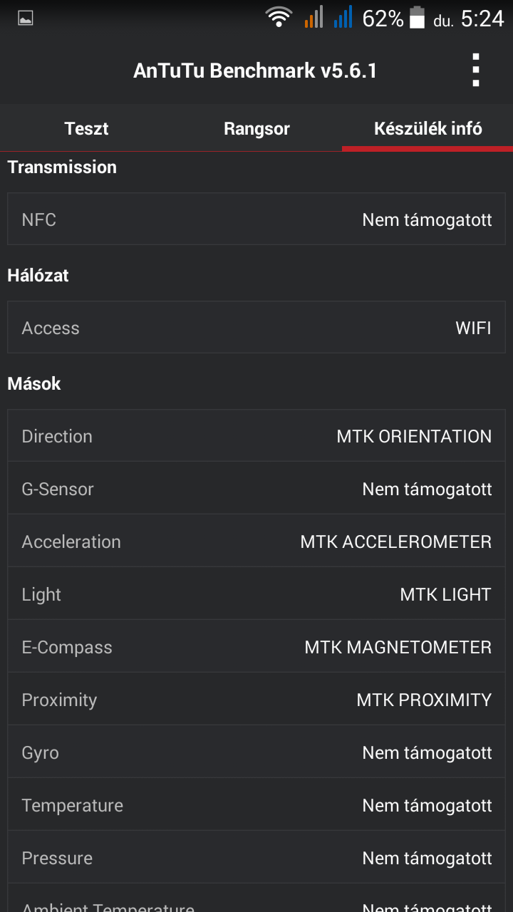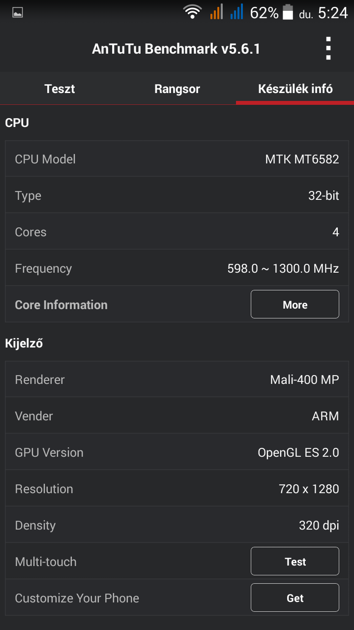 Processzor: MediaTek MT6582 Quad-Core 1,3 GHz, Mali-400MP2