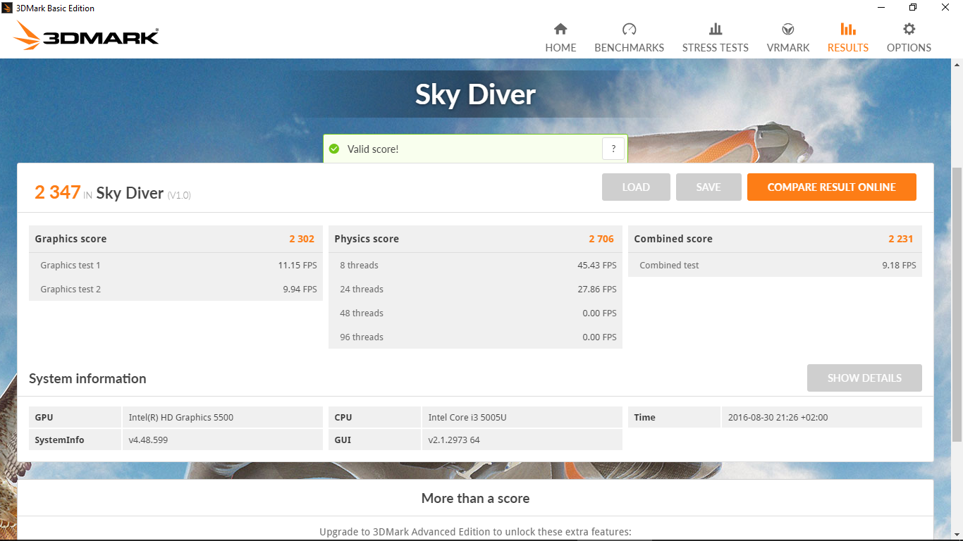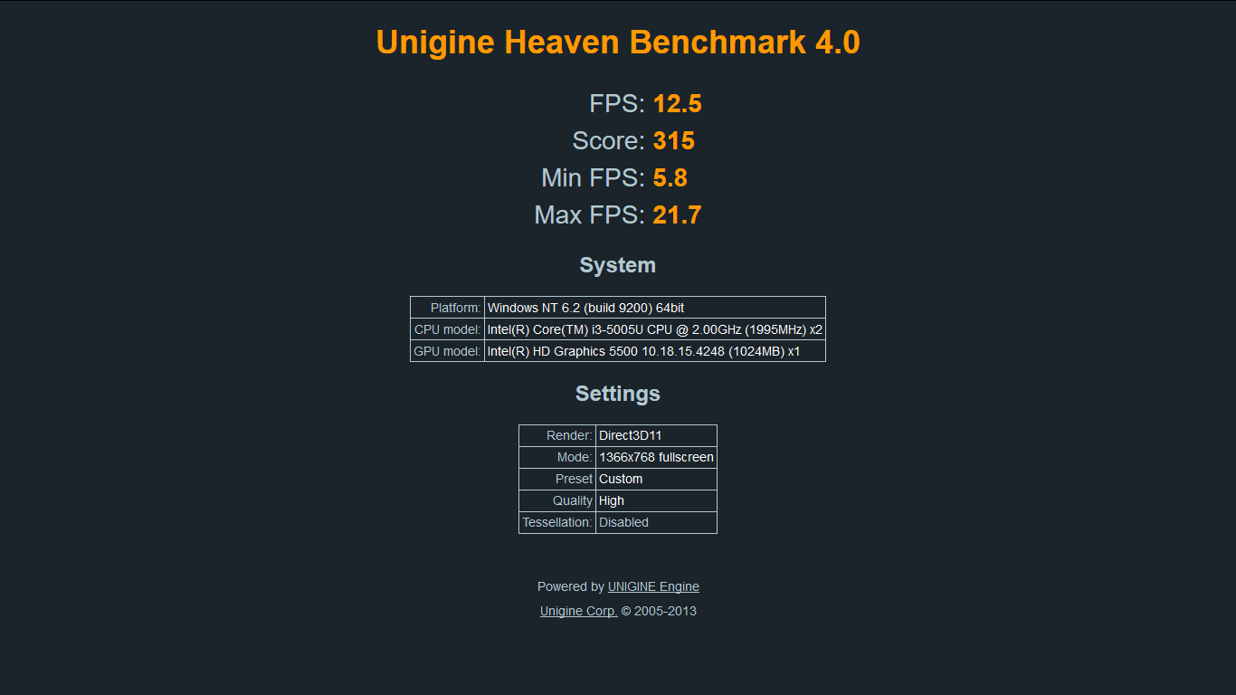 Heaven Benchmark 4.0 / az Intel®HD Graphics 5500 vezérlő egész jól vette az akadályt, természetesen megjött a hangja a gépnek, de az alapbeállításokon jól vette a tesztet