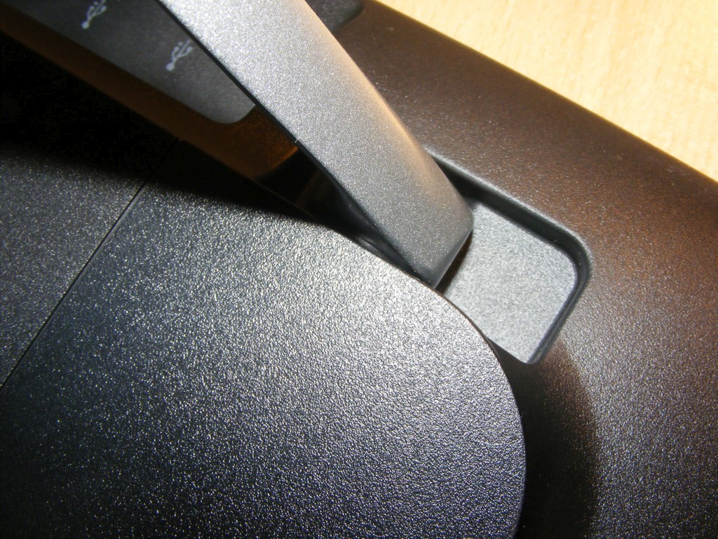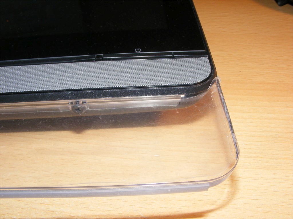 Nagyon nagy erősségének tartom a hátuljára szerelt praktikus állványt, ami masszív, egyáltalán nem kelt gagyi hatást, ráadásul segítségével a monitor 80 fokban dönthető. Az előlapon lévő átlátszó rész műanyagból készült, bár teljesen olyan, mintha üveg lenne. Egyébként erre támaszkodik az egész kijelző. Az alsó peremén van egy ragasztott gumicsík, ami a csúszást gátolja.
