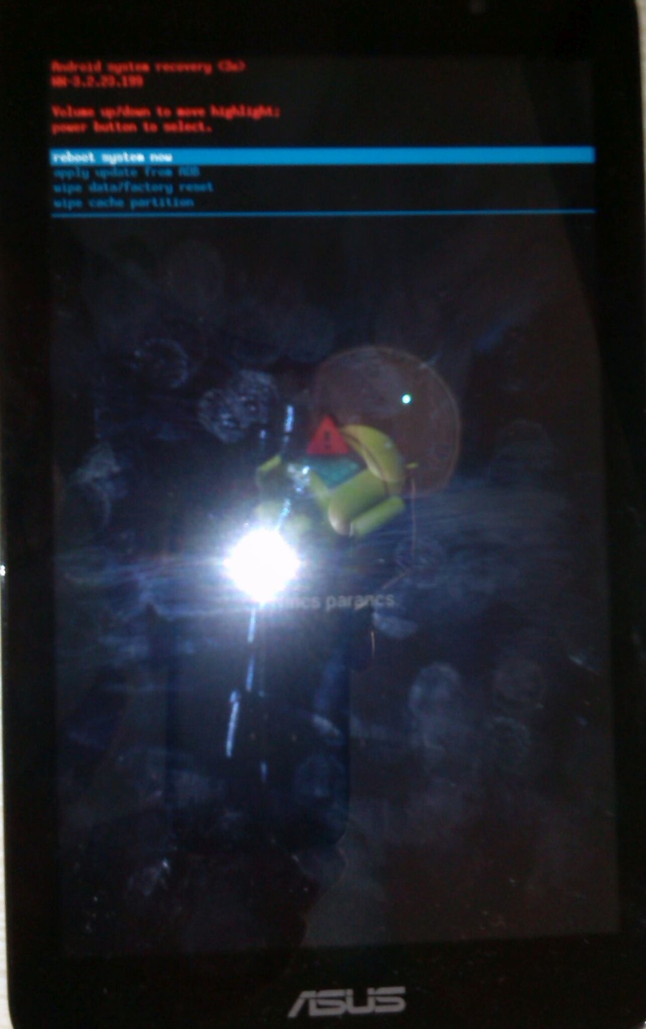 - A készülék újraindul, majd bejön egy hanyatt fekvő Droid, hasában egy piros háromszög felkiáltójellel, opcionálisan egy Nincs parancs felirat