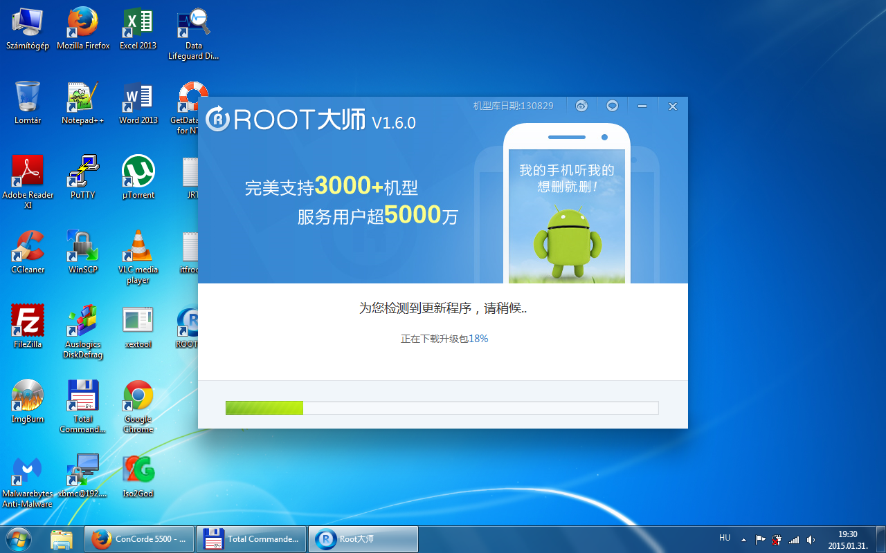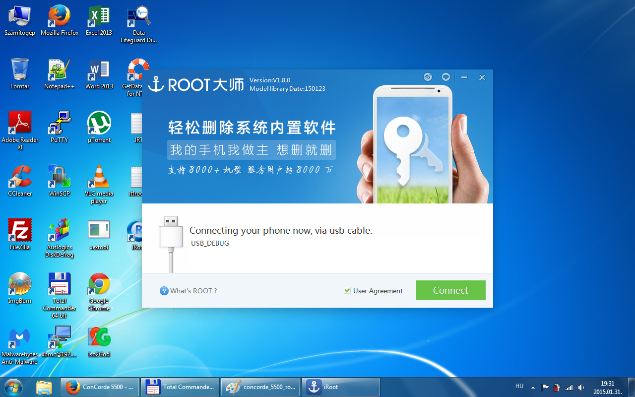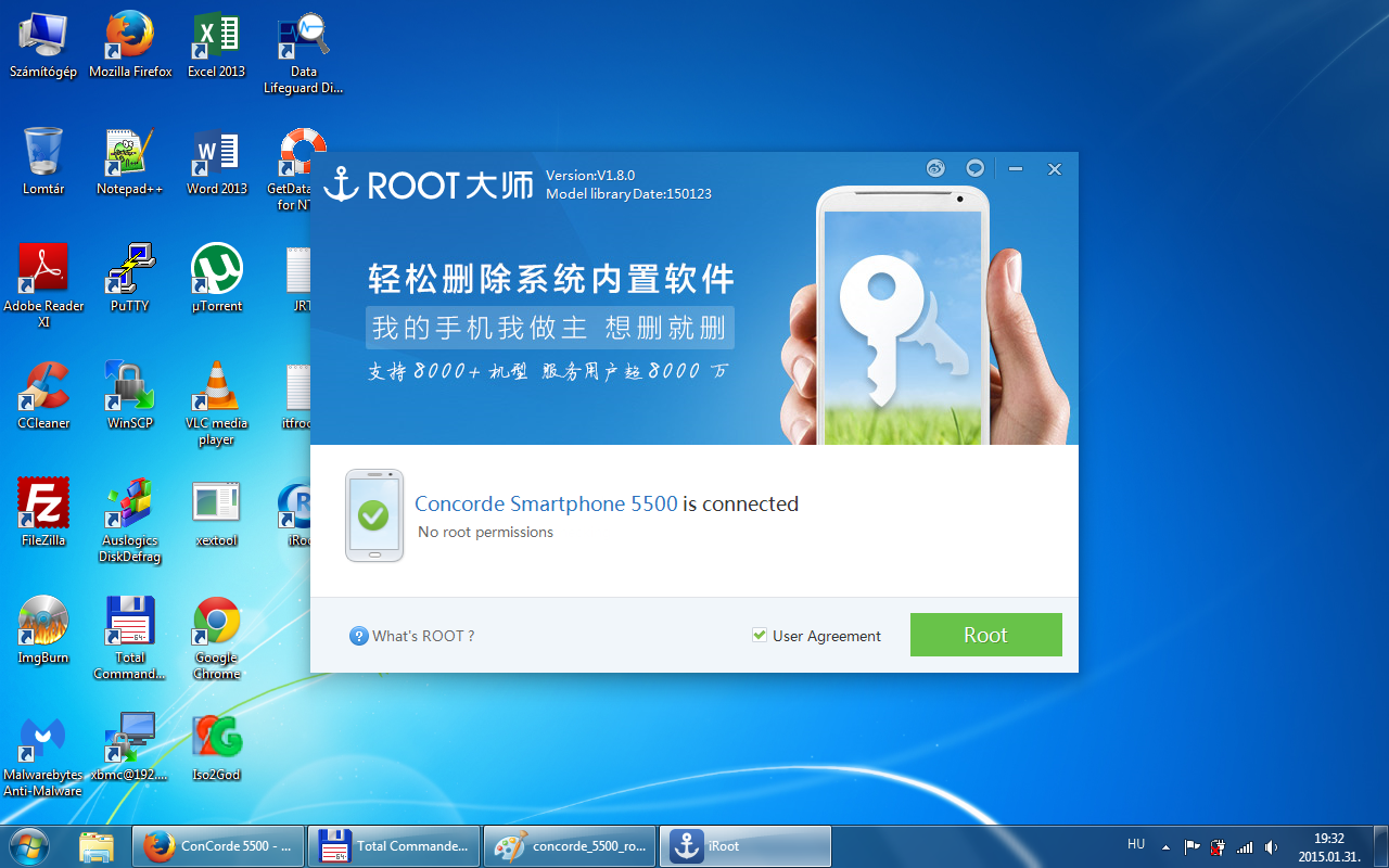 Elindul a program! Sajnos kínai nyelvű! A programot rendszergazdaként telepítsd! Majd letölti a frissítéseket és kiírja, hogy csatlakoztasd az eszközt! Sok dolgod nem lesz csatlakoztatod és rányomsz a root gombra, a telefon újraindul és root-olt lesz! De még ezzel nem végeztünk…