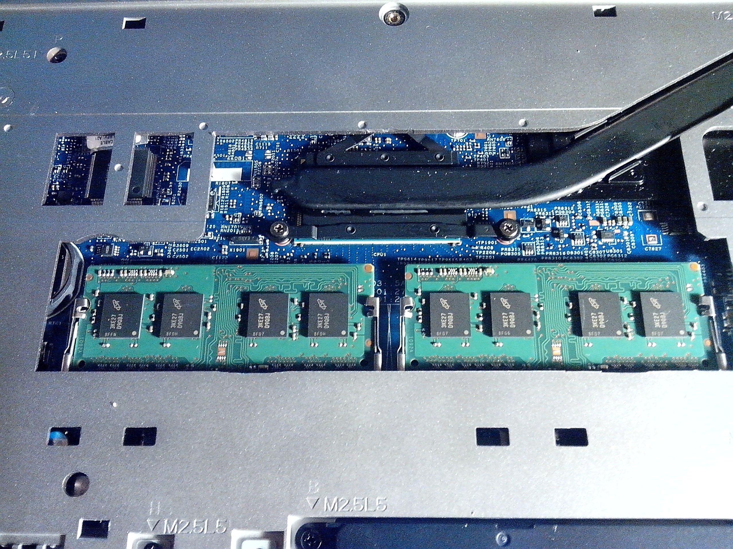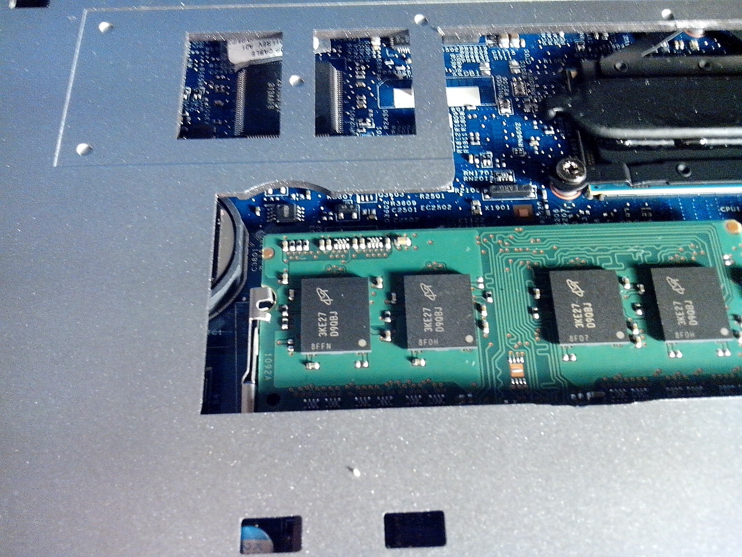 A memóriacsere a szokásos egyszerű módon történhet. Az alaplapi gombelem (CR2032) eltávolításához további csavarok eltávolítása szükséges.