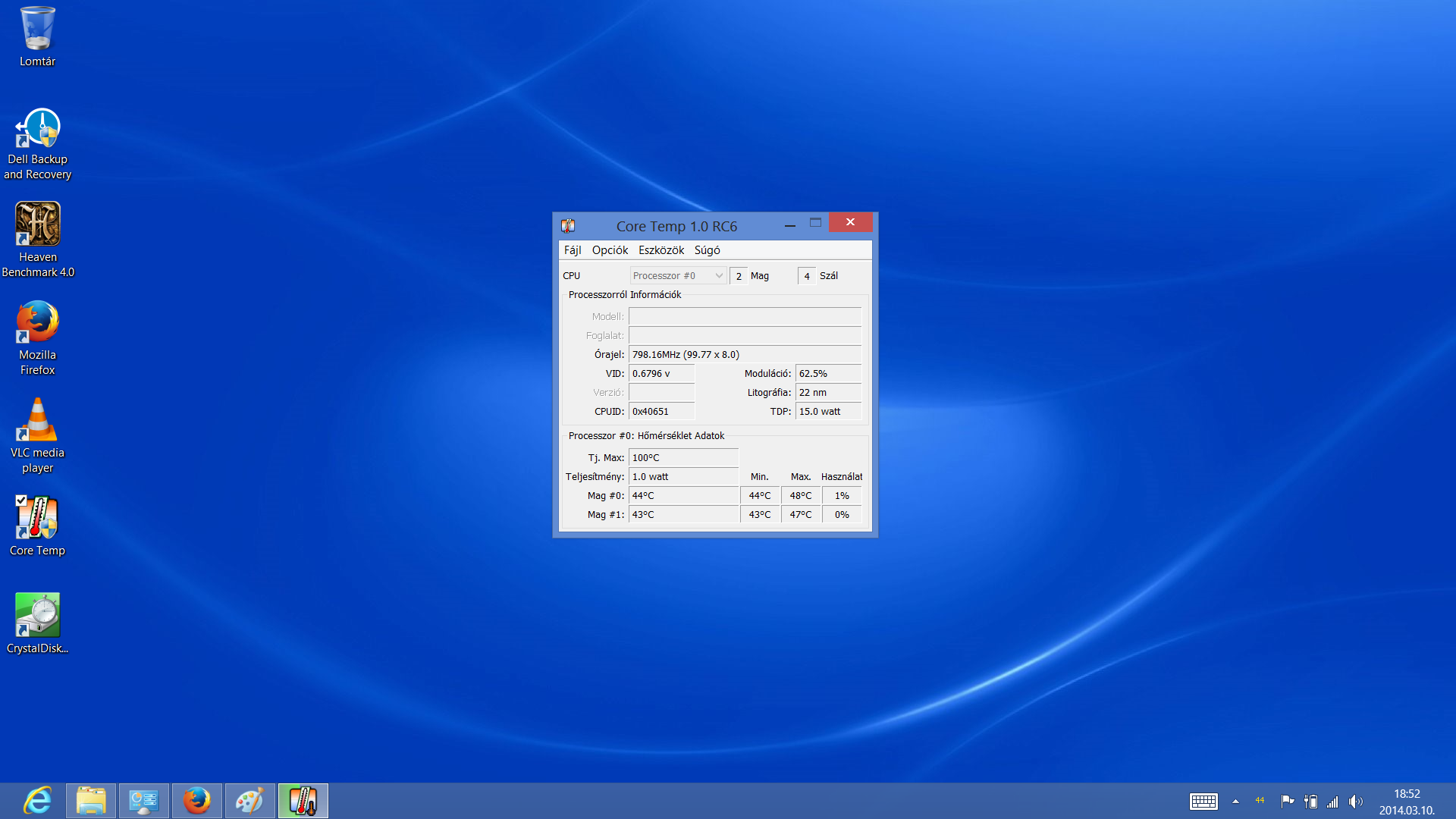 CoreTemp által mért maximum, minimum cpu hőmérsékletünk! Azért szépen lassan felmásztunk 55 fokra, ami a képen nem látható!