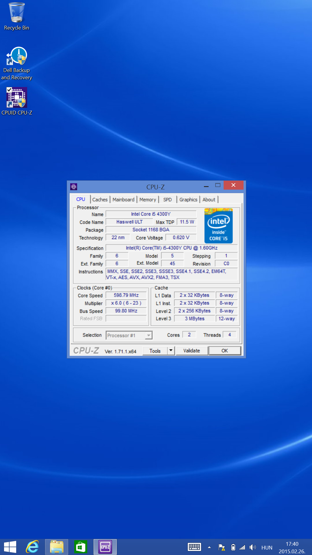 Processzor: Intel Core i5-4300Y 1,6GHz