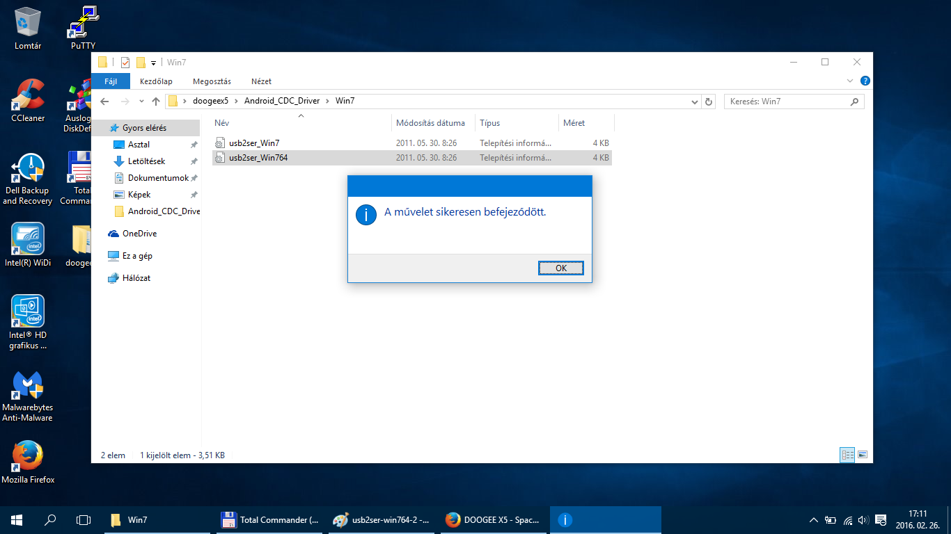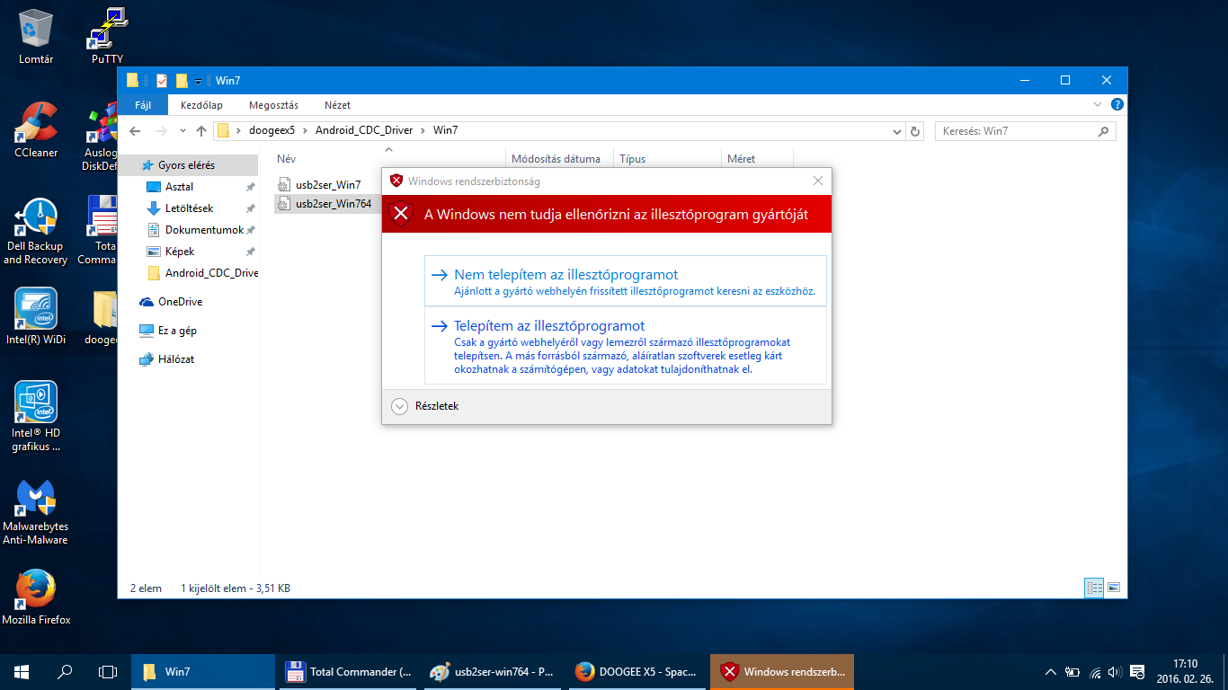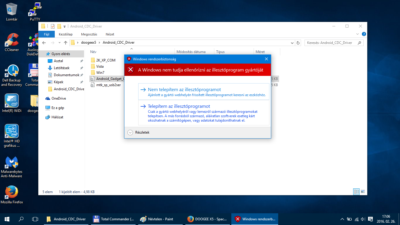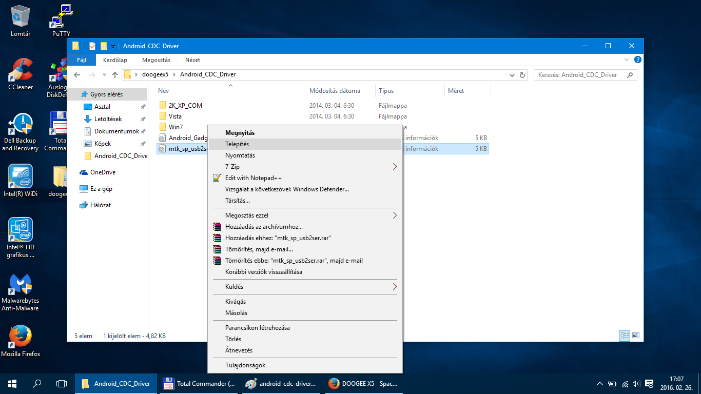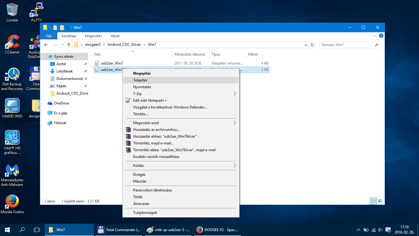 Miután kikapcsoltuk az illesztőprogram-aláírás megkövetelésének ellenőrzését, töltsük le az alábbi csomagokat. Miután letöltöttük csomagoljuk ki a zip állományokat egy tetszőleges helyre. Az Android CDC Driver mappában lévő Android_Gadget_CDC_driver.inf, mtk_sp_usb2ser.inf és azon belül a Win7 mappában lévő usb2ser_Win764.inf fájlokat kell telepíteni. Nem 64bites operációs rendszer esetén a usb2ser_Win7.inf fájlt telepítsd a Win7 mappából. A telepítés egyszerű, a fájlra viszed az egérmutatót jobbklikk és telepítés.