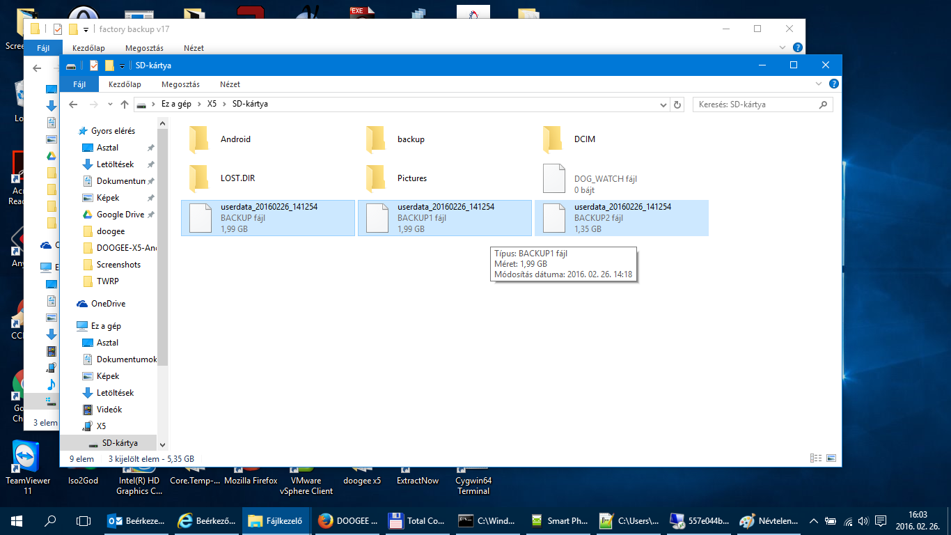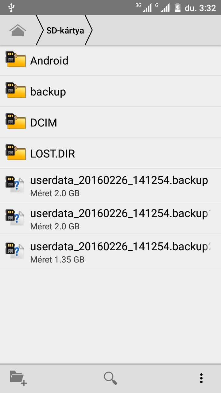 A videóban látható, hogyan kell a recoveryt elindítani. A telefonunkban legalább 8Gb-os microSD legyen, hiszen arra megy a mentés. Miután beléptünk a recoverybe hangerő gombokkal navigáljunk a backup user data menüpontra és nyomjunk a bekapcsoló gombra. A mentés egy ideig el fog tartani, ha lefutott navigáljunk a reboot system now menüpontra és nyomjuk meg a bekapcsoló gombot. A microSD kártyán lesznek a fájlok (3DB) userdata_20160226_141254.backup, userdata_20160226_141254.backup1, userdata_20160226_141254.backup2, vagy valami hasonló nevekkel. Ezeket a fájlokat másoljuk fel a gépünkre egy mappába, hogy meglegyen. Igaz, nem hiszem, hogy valamire is fogjuk használni, de jó hogy ilyen mentésünk is van.