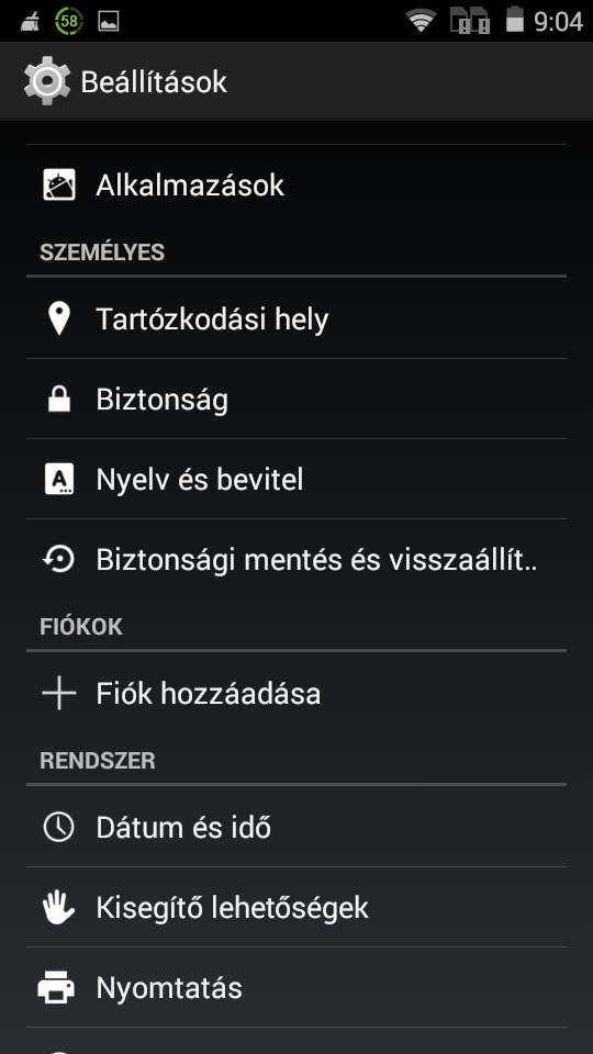 Rendszer, Beállítások: