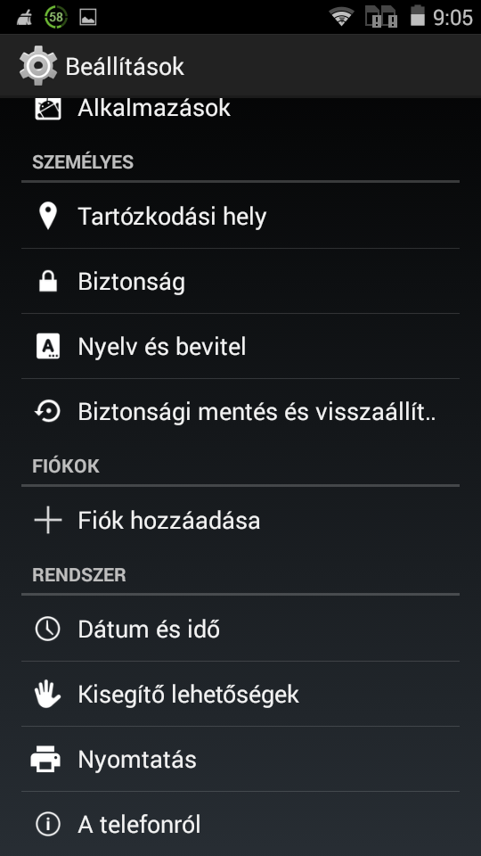 Rendszer, Beállítások: