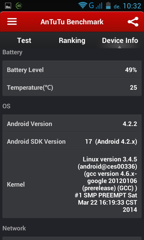 A telefonon Android Jelly Bean 4.2.2 operációs rendszer fut, megkaptunk rá majdnem minden Google alkalmazást előtelepítve. A rendszerben semmilyen extra applikáció, vagy szolgáltatás nincs integrálva, mondhatni a „default” Androidot kapjuk. Az Android használata során hibába nem ütköztem, habár a GSmart telefonoknál azt már megfigyelhettük, hogy nincs USB-hibakeresés opció. Ilyenkor, ha szeretnénk előhozni a FEJLESZTŐI LEHETŐSÉGEKET a beállítások menüponton belül, akkor menjünk a Beállítások – A telefonról menüpontba. Majd addig nyomkodjuk a legalsó pontot ujjunkal (Build-szám), amíg ki nem ír egy üzenet, hogy Ön most már fejlesztő. Eztuán a Beállítások menüpontban meg fog jelenni a fejlesztői lehetőségek, és azon belül az USB-hibakeresés funkció!