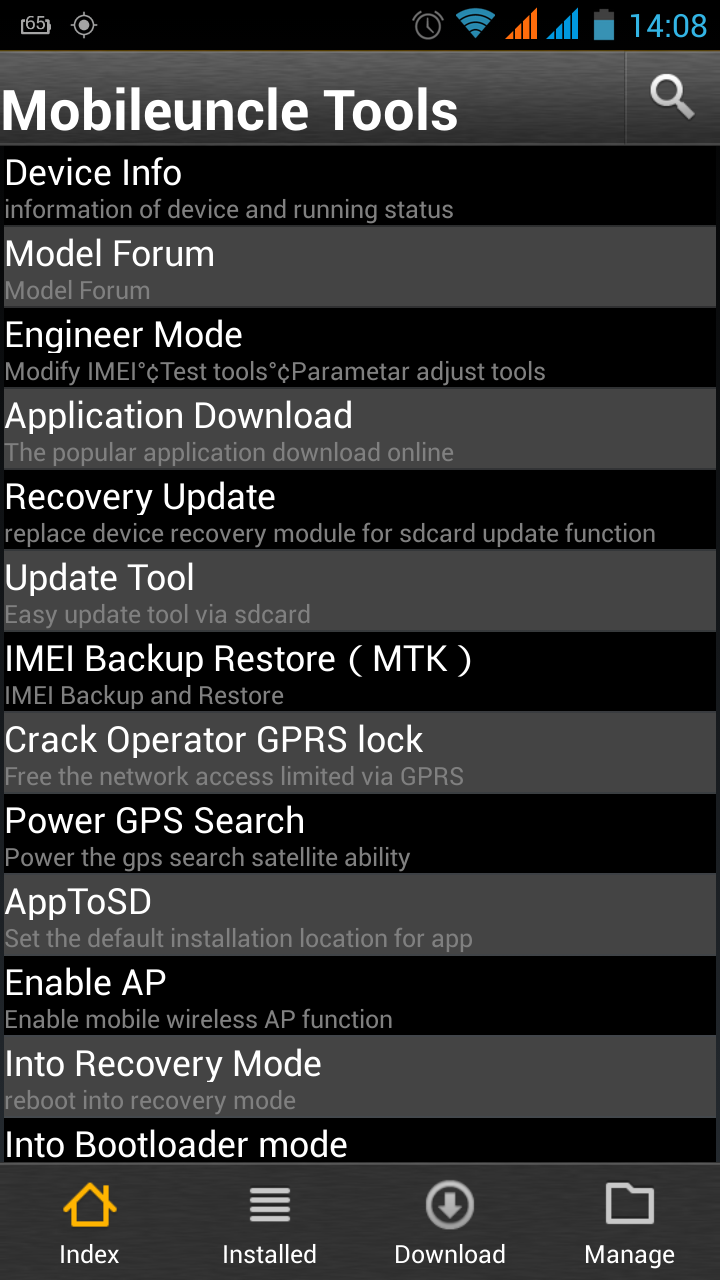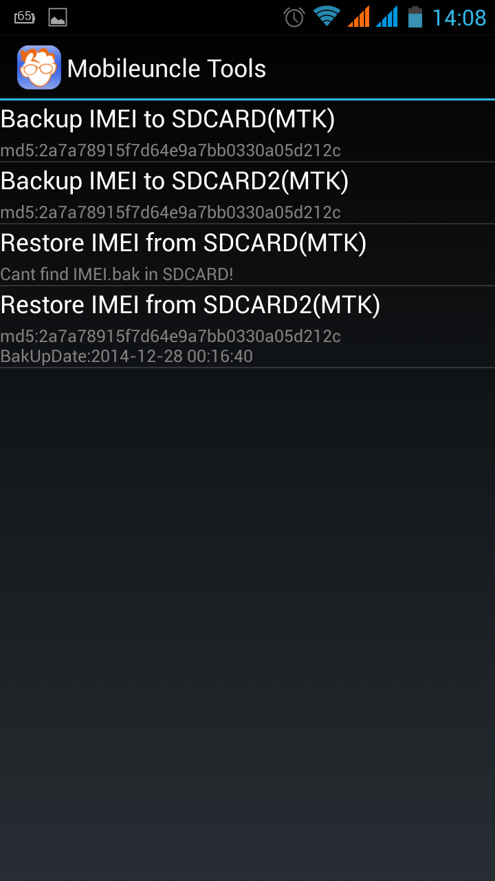 Mentsük le az IMEI-t a Mobileuncle MTK Tools segítségével! Nem bonyolult művelet, az alábbi képeken is látható. Az IMEI Backup Restore ( MTK ) menüpontot kiválasztva menthetjük, illetve visszaállíthatjuk belső, vagy külső tárhelyünkről. A program egy IMEI.bak állományt hoz létre, ezt a fájlt több helyen is tároljuk!!! Legyen meg, mert ha costum romok között „repülgetünk” szükségünk lehet rá! De ez csak egy ideiglenes megoldás lehet, mivel egy Factory reset után mindig elveszted az IMEI számodat. De ez is egy alternatíva, hogy tudd használni a telefonodat. Ezért kell mentés csinálni az MTKDroidTools-al az nvram-ról is, meg persze van még pár megoldás az IMEI visszaírására!