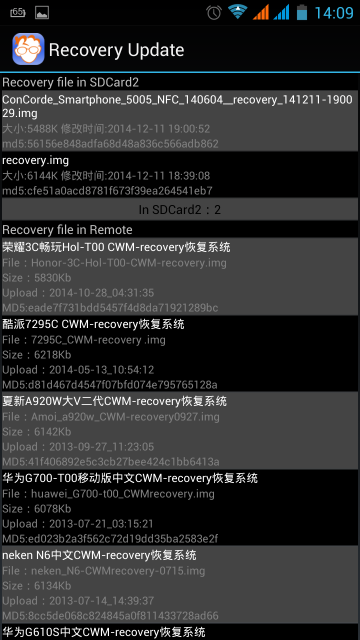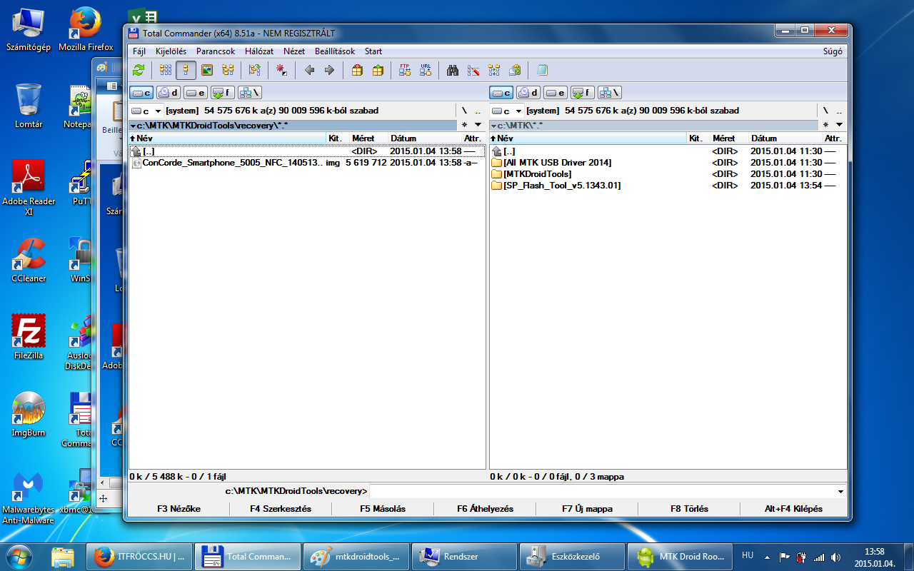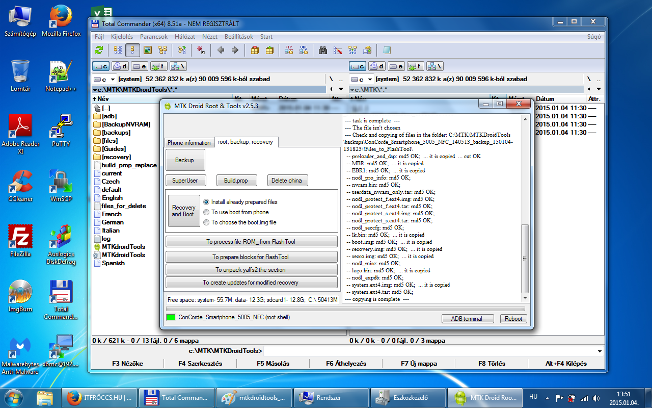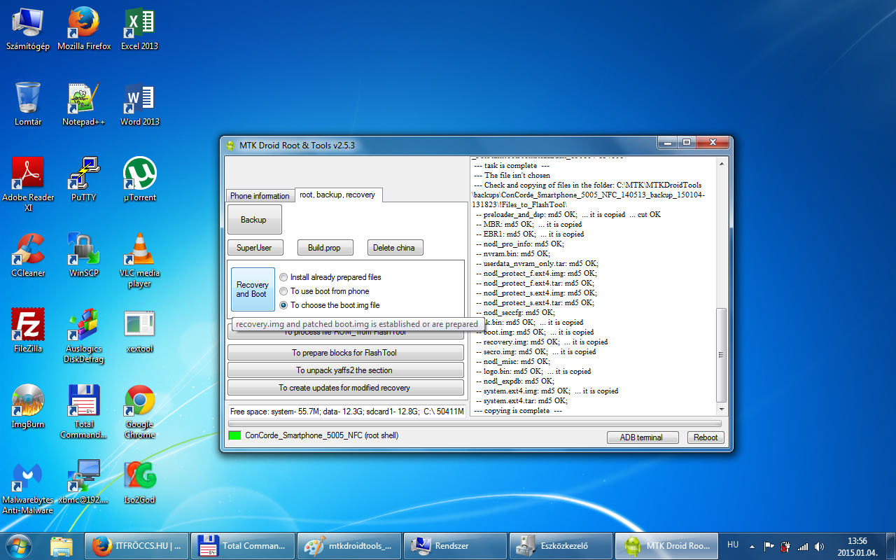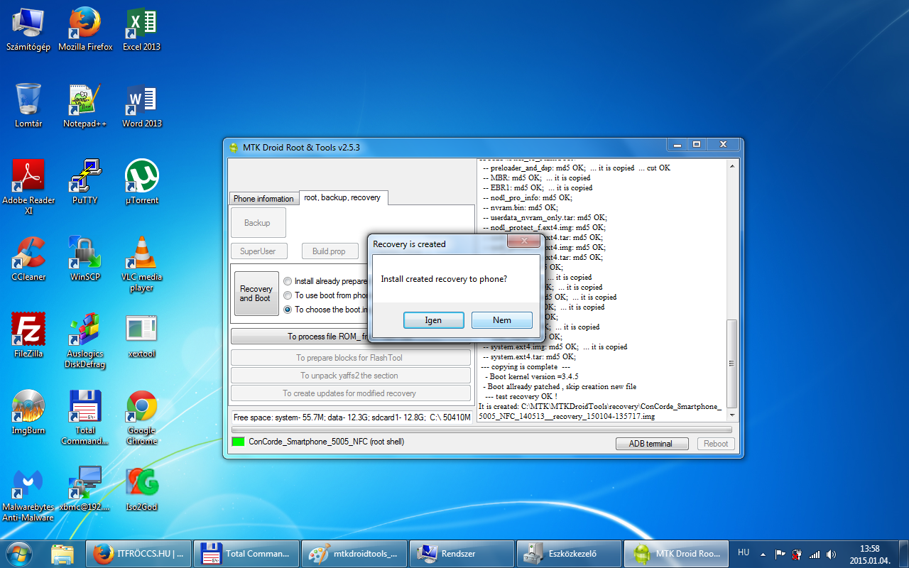 A mentésből ami a backups mappában van a recovery.img-t (ez a gyári recovery) és az MTKDroidTools által generált recovery mappában ConCorde_Smartphone_5005_NFC_140513__recovery_150104-135717.img-t (ez a CWM) is felmásolom a telefon microSD kártyájára. A Mobileuncle MTK Tools alkalmazás segítségével, pedig a Recovery Update menüpont alatt tudjuk telepíteni attól függően, melyiket szeretnénk használni. Más recovery-t ne telepíts a Mobileuncle MTK Tools-al, csak azt amit a telefonra másoltál!!!