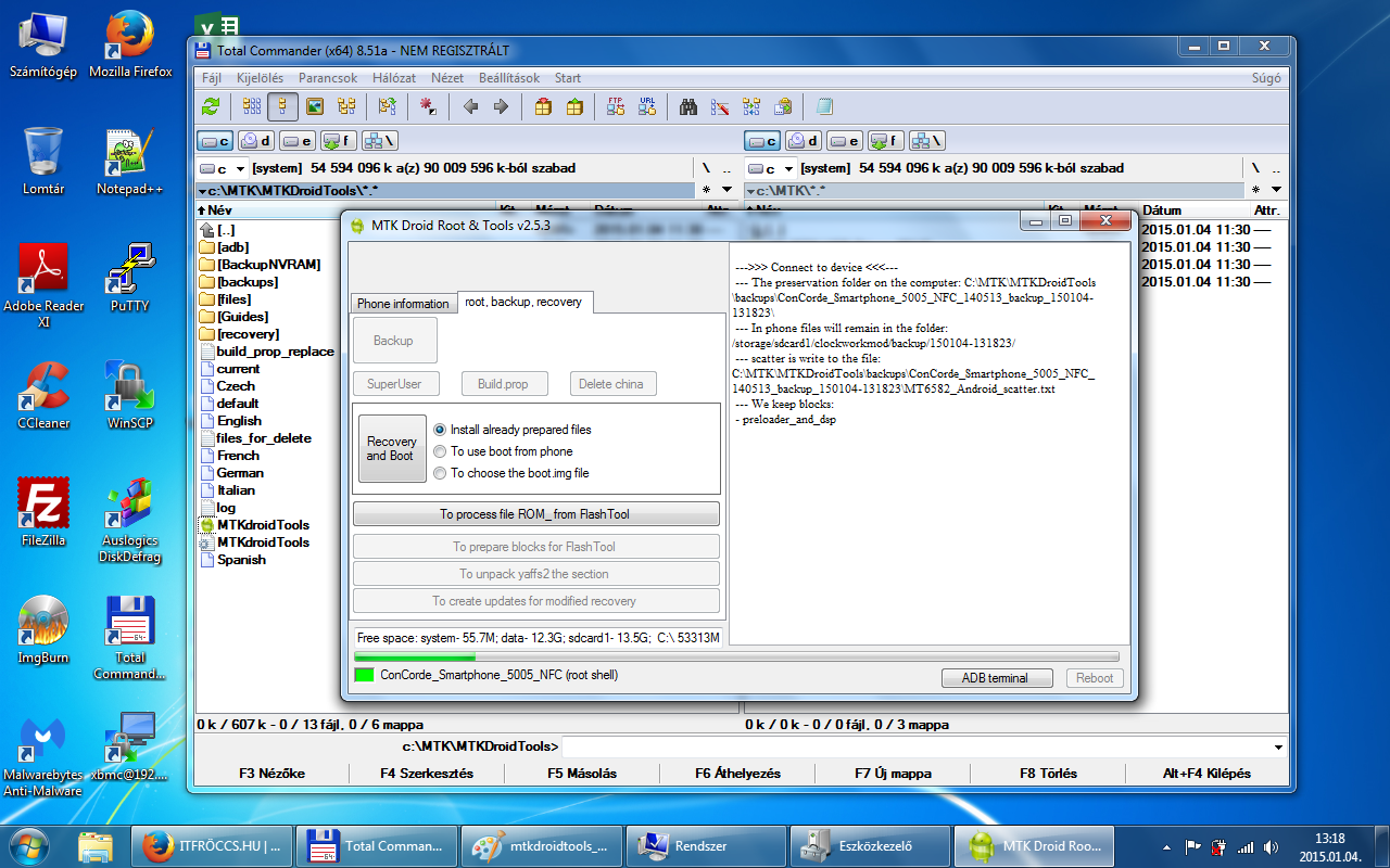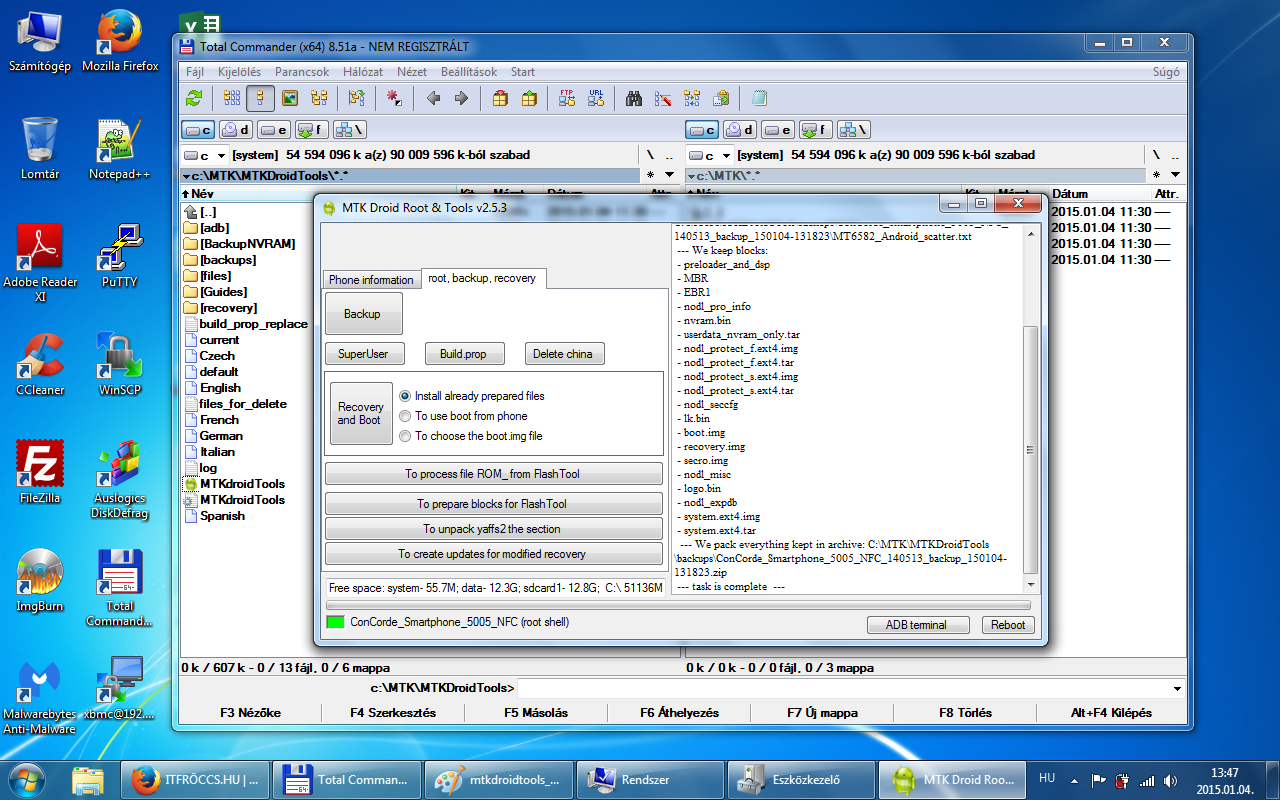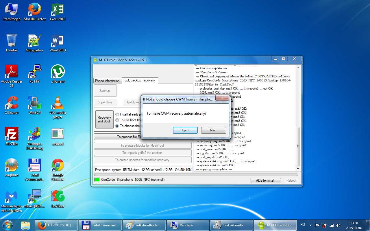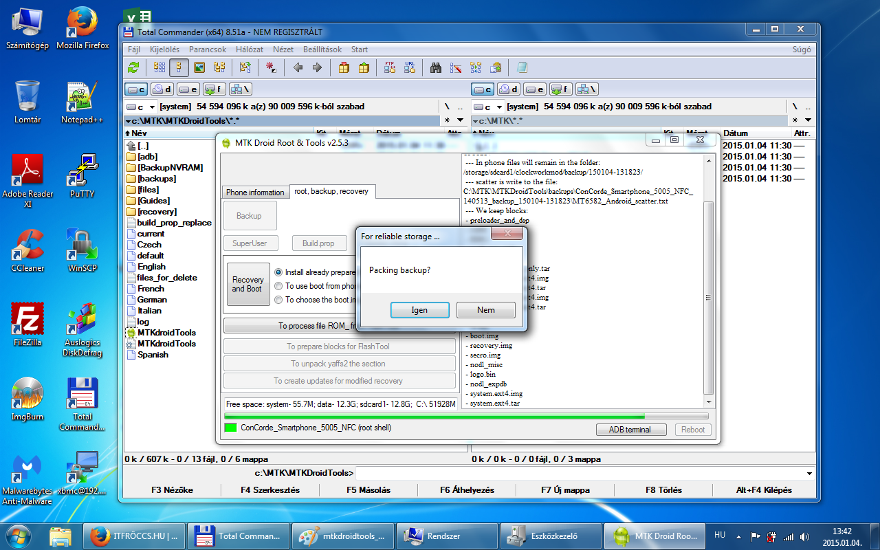 A root, backup, recovery fülre kattintva ott van egy Backup gomb. Erre kattintva indul el a mentés a rom-ról, az MTKDroidTools mappán belül van egy backups mappa, oda fog elkészülni a mentés! Ez egy jó ideig el fog tartani! Hasonló néven fog elkészülni egy ilyen mappába: ConCorde_Smartphone_5005_NFC_140513_backup_150104-131823 Mentés vége előtt a program megkérdezi, hogy akarjuk tömöríteni a mentést? /Packing backup?/ Nyugodtan kattintsunk az igenre és létre fog jönni egy ConCorde_Smartphone_5005_NFC_140513_backup_150104-131823.zip csomag a backups mappában! Ez ugyan az a mentés, mint ami a ConCorde_Smartphone_5005_NFC_140513_backup_150104-131823 mappádban van, csak tömörítve! Fontos, hogy a telefonban a microSD kártyánkon legyen elég hely, mivel a mentés során a program oda is készít egy mentést! A microSD kártyán a clockworkmod/backup/ mappádban lesz egy dátumos mentés, valami hasonló névvel 150104-131823. Ezt a mentést is őrizzük meg, mert szükség lehet rá! Az általunk generált CWM recovery segítségével visszatölthető!