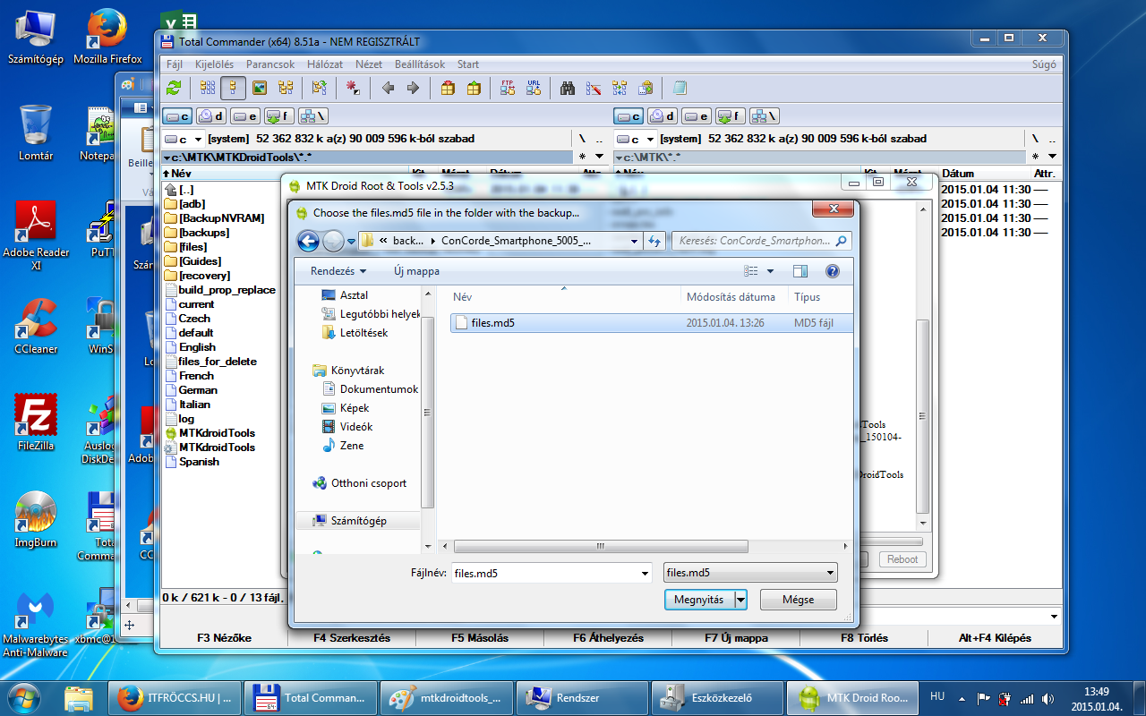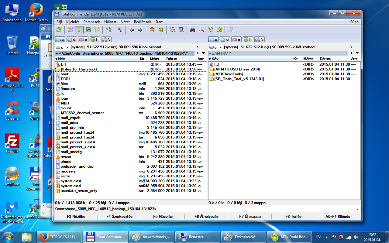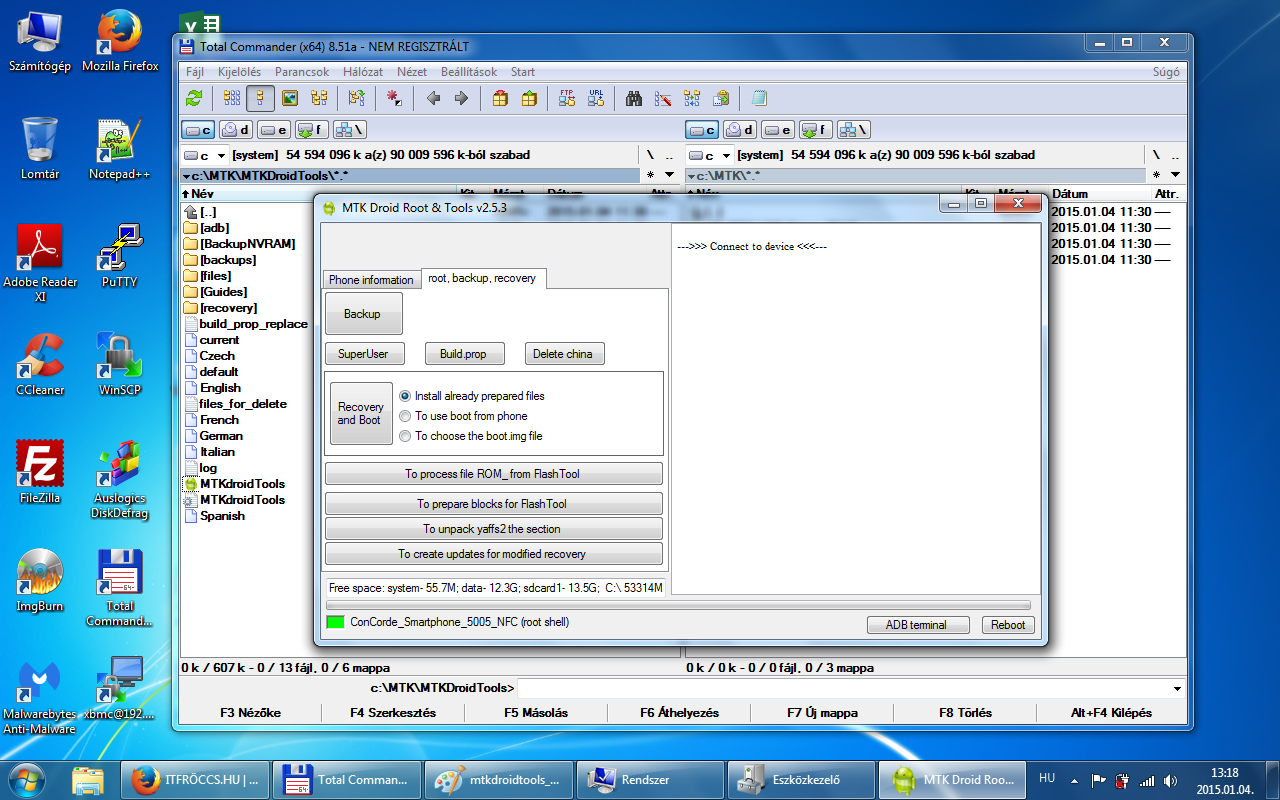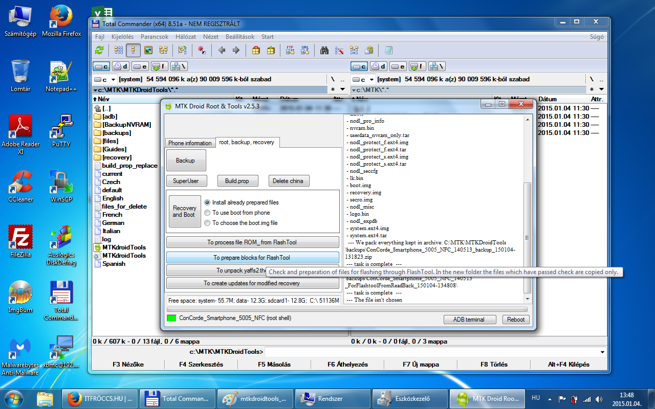 A root, backup, recovery fülre kattintva ott van egy Backup gomb. Erre kattintva indul el a mentés a rom-ról, az MTKDroidTools mappán belül van egy backups mappa, oda fog elkészülni a mentés! Ez egy jó ideig el fog tartani! Hasonló néven fog elkészülni egy ilyen mappába: ConCorde_Smartphone_5005_NFC_140513_backup_150104-131823 Mentés vége előtt a program megkérdezi, hogy akarjuk tömöríteni a mentést? /Packing backup?/ Nyugodtan kattintsunk az igenre és létre fog jönni egy ConCorde_Smartphone_5005_NFC_140513_backup_150104-131823.zip csomag a backups mappában! Ez ugyan az a mentés, mint ami a ConCorde_Smartphone_5005_NFC_140513_backup_150104-131823 mappádban van, csak tömörítve! Fontos, hogy a telefonban a microSD kártyánkon legyen elég hely, mivel a mentés során a program oda is készít egy mentést! A microSD kártyán a clockworkmod/backup/ mappádban lesz egy dátumos mentés, valami hasonló névvel 150104-131823. Ezt a mentést is őrizzük meg, mert szükség lehet rá! Az általunk generált CWM recovery segítségével visszatölthető!