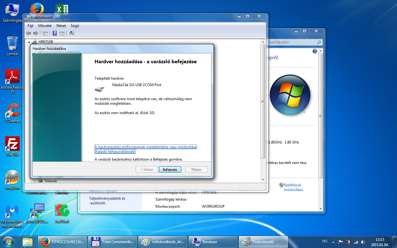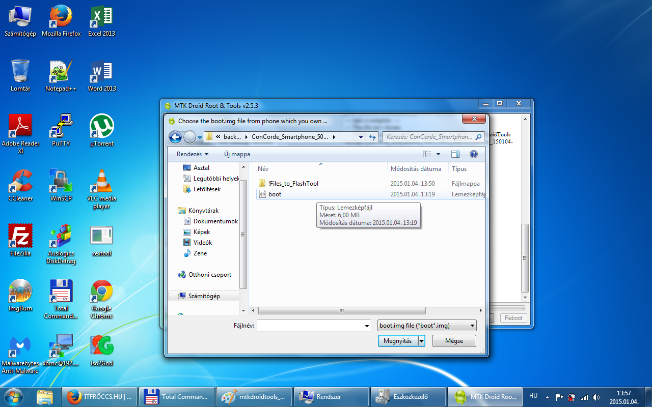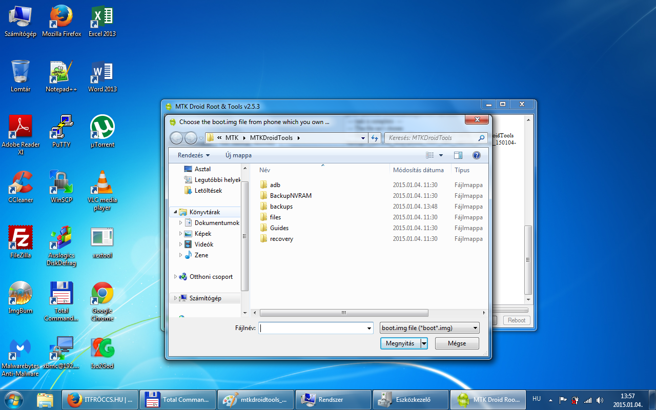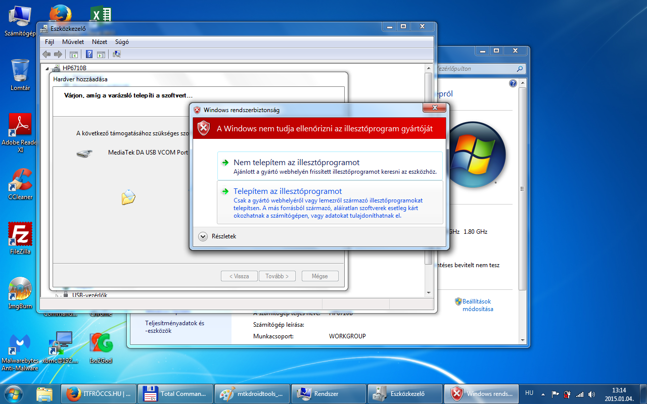 Az All MTK USB Driver 2014\All MTK Drivers\MT65xx Preloader\Win7\ mappában lévő usb2ser_Win764.inf-et kell telepíteni, de ezt már eszközkezelőből. Abban az esetben, ha 32bit-es rendszerünk van, akkor a usb2ser_Win7.inf-et.