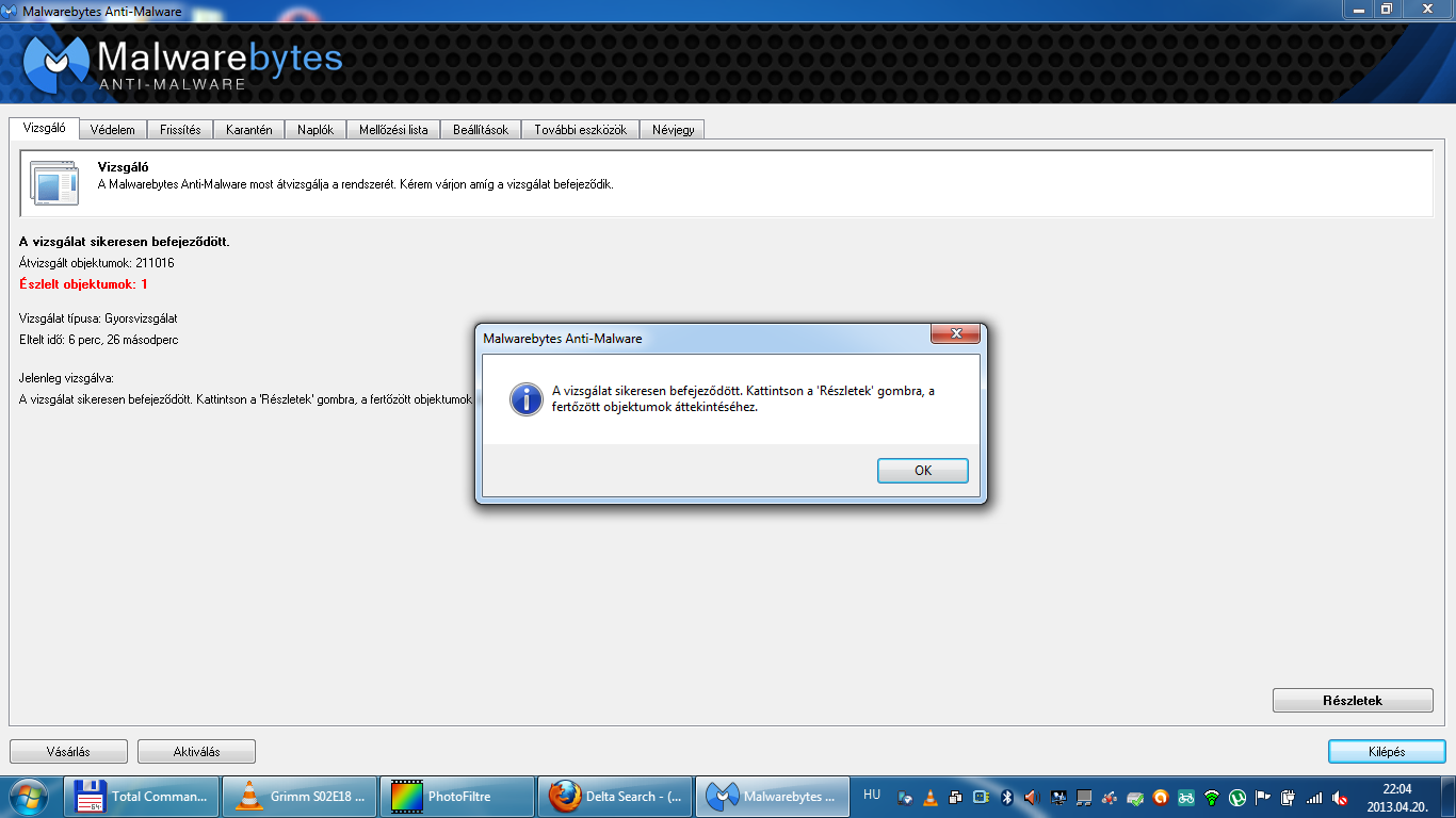 - Indítsd el, futtasd a teljes rendszer vizsgálatot és ha talál valamit, távolítsd el. (A vizsgálat előtt zárj be minden nyitva lévő szoftvert, böngészőablakot.)
