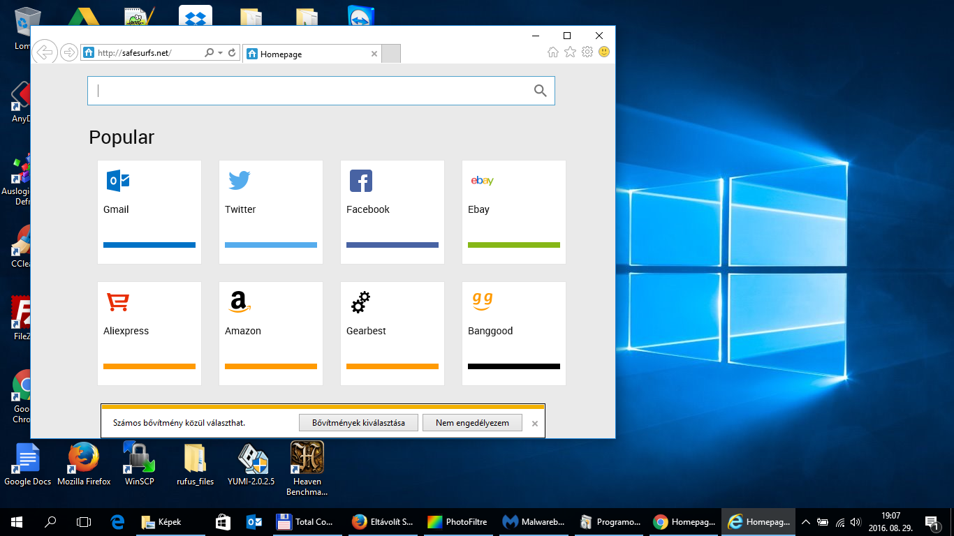 - alaphelyzetbe állítottam a Chrome, Firefox, iExplorer böngészőket, de ismételten előjött a safesurfs