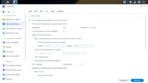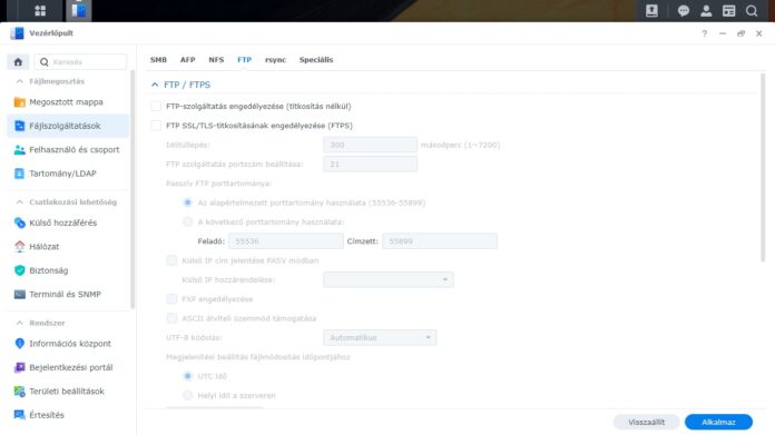 A szolgáltatást a Vezérlőpult -> Fájlszolgáltatások résznél található FTP fülön tudjuk bekapcsolni. Paraméterezhetünk SSL/TLS titkosítást (FTPS), Időtúllépést, megadhatunk egyedi portot, egyedi passzív portartományt, SFTP szolgáltatást, Sebesség korlátozást és egyéb beállításokat. Jelen esetben csak egy FTP szolgáltatást engedélyezek, a többi beállítást most alapértéken hagyom. Természetesen éles helyzetben a default 21-es portot és a passzív porttartományt célszerű megváltoztatni!