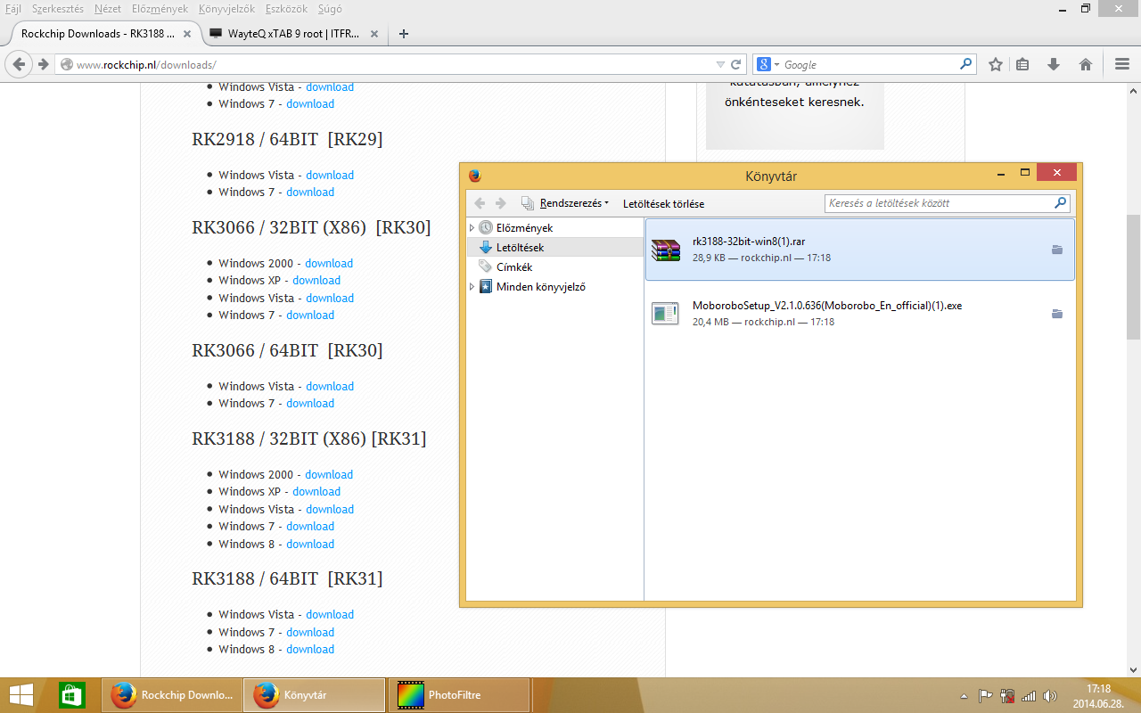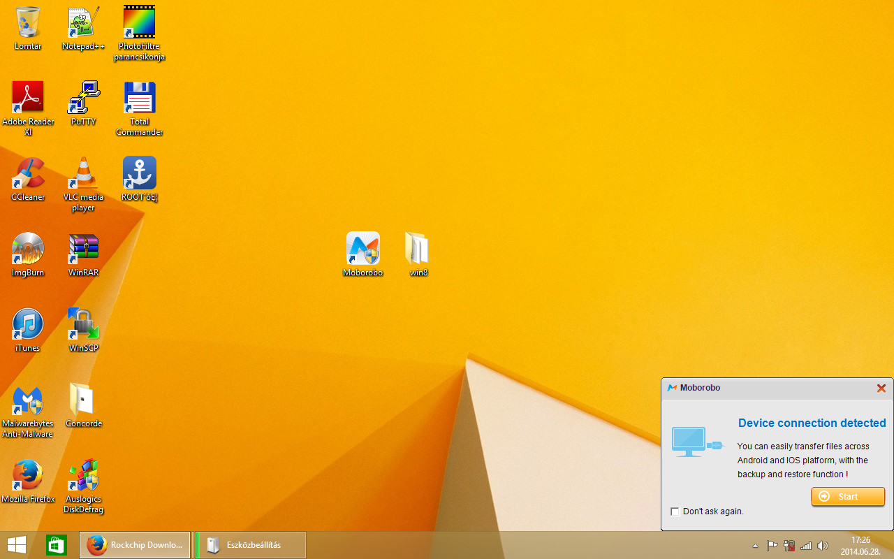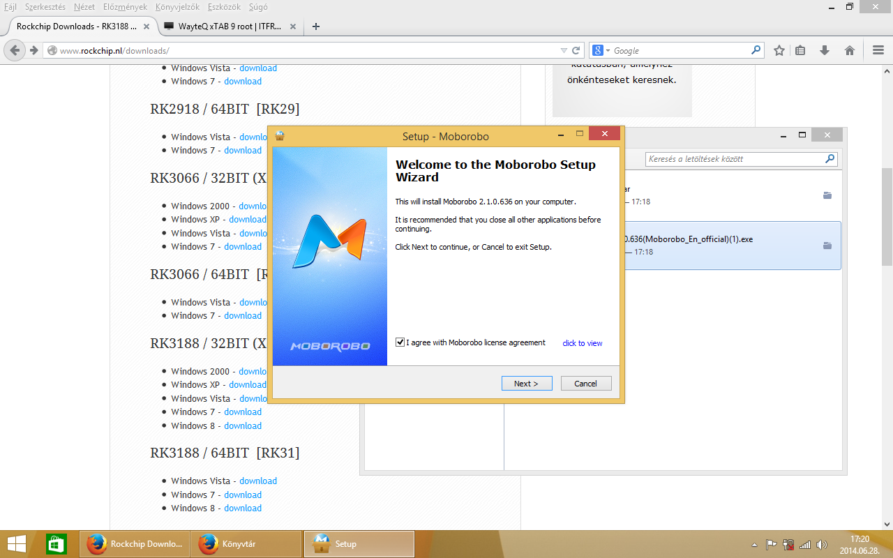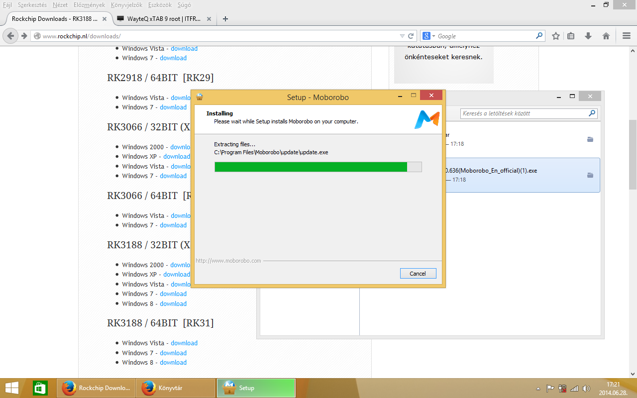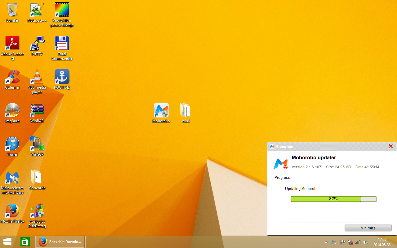 A letöltött Rockchip driver-t kicsomagoltam az asztalra, egy win8 nevű mappába, majd a letöltött Moborobo versie 2.1-es programot telepítettem a gépemre! (next-next stb…) Indulás után várjuk meg, amíg a program automatikusan telepíti a frissítéseket.