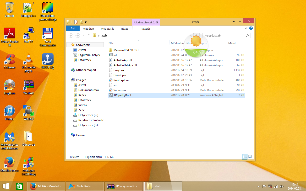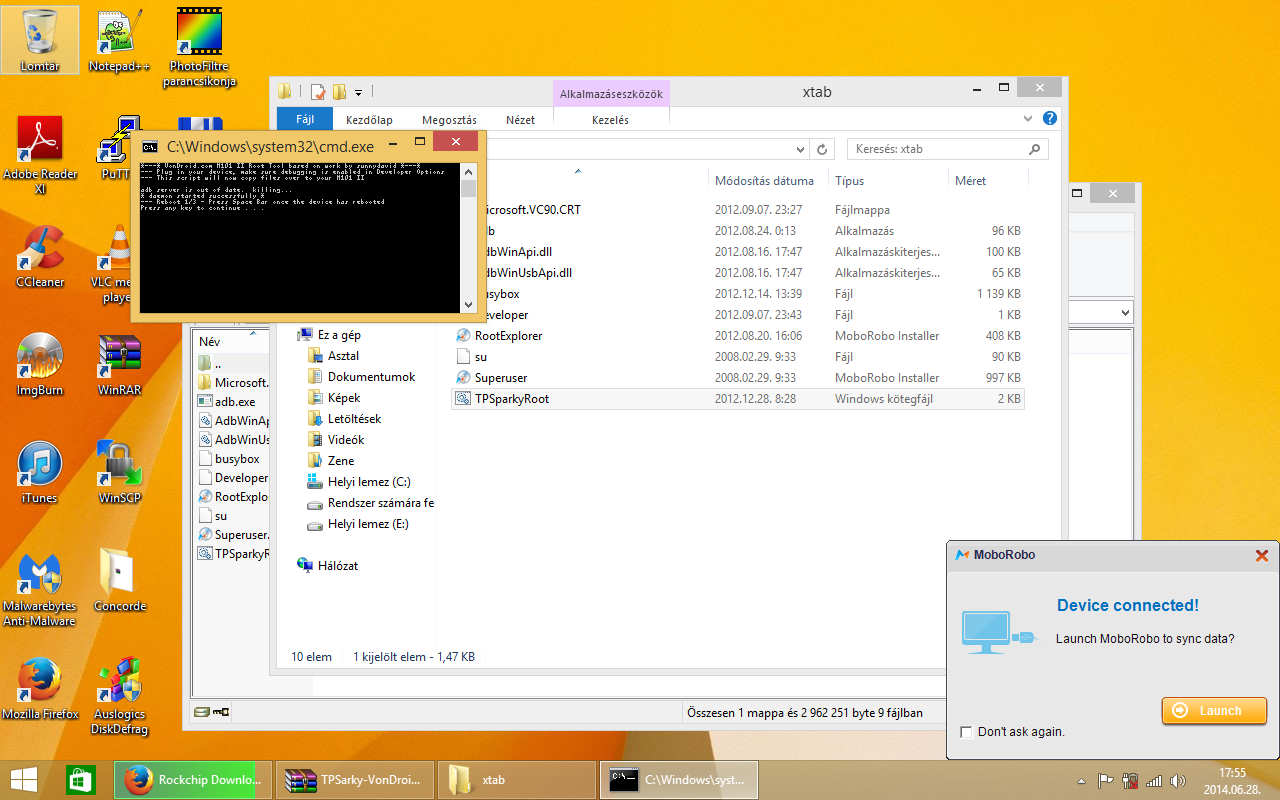 A letöltött TPSarky Von Droid csomagot tömörítsük ki valahová! Én az asztalomra csomagoltam ki, egy xtab mappába. Majd indítsuk el a TPSparkyRoot.bat-ot, de ne rendszergazdaként! Érdekes, csak duplaklikkeléssel indult el jól a root-olási folyamat!