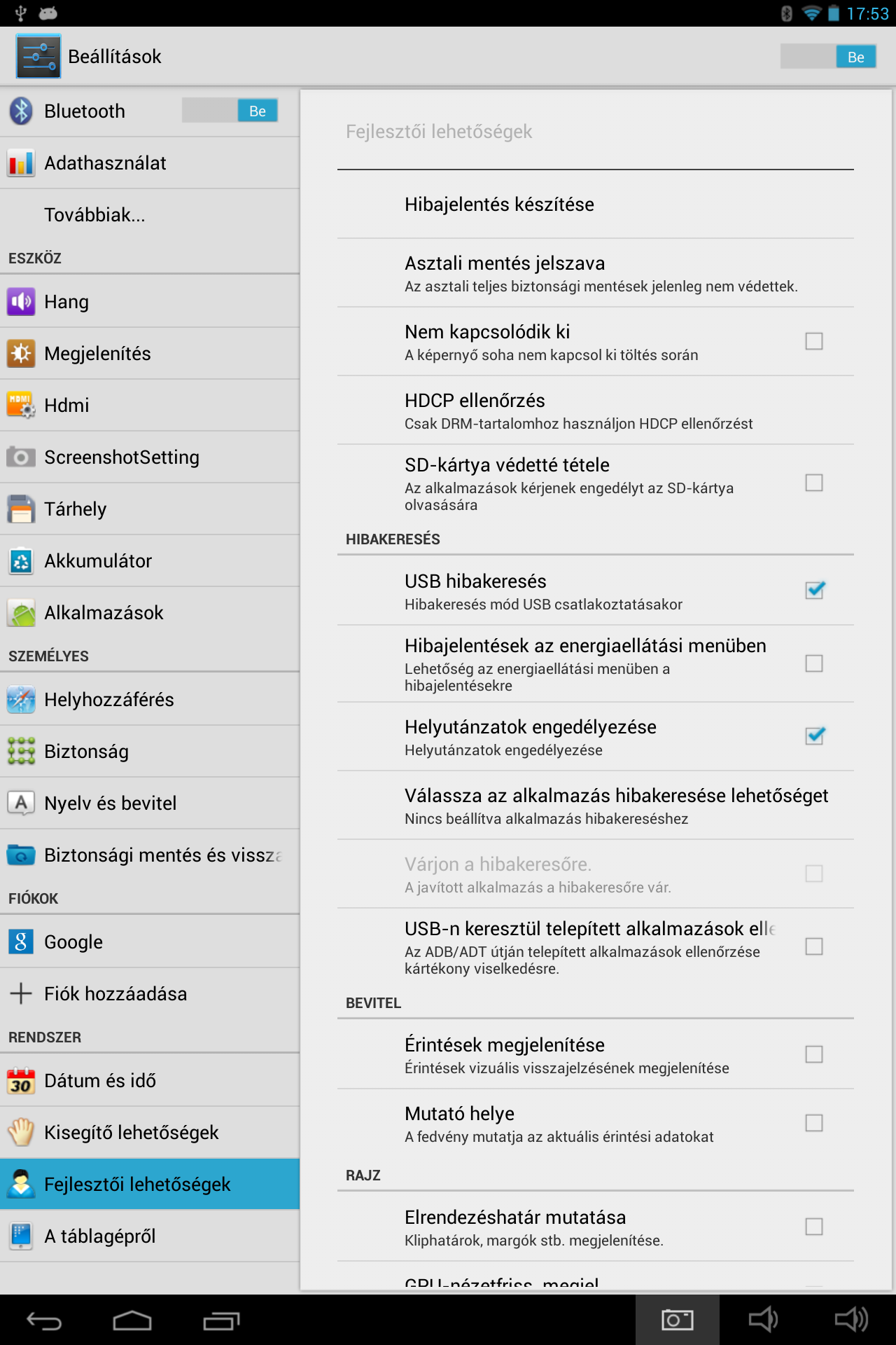 Operációs rendszerünk Android Jelly Bean 4.2.2. Rockchip 3188-as chipkészlet van gépünkben. Lássunk neki!