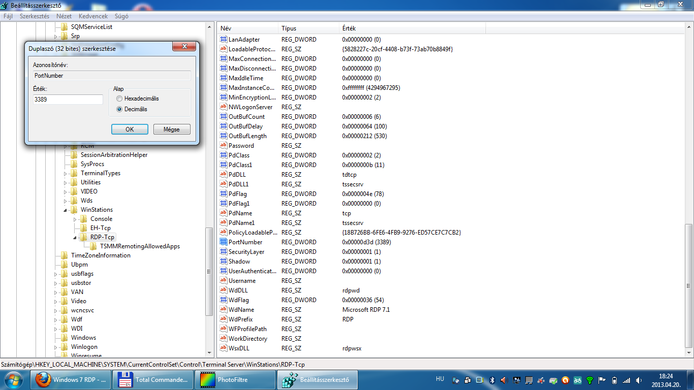Navigáljunk a regedit -ben ide: HKEY_LOCAL_MACHINE\System\CurrentControlSet\Control\TerminalServer\WinStations\RDP-Tcp\PortNumber