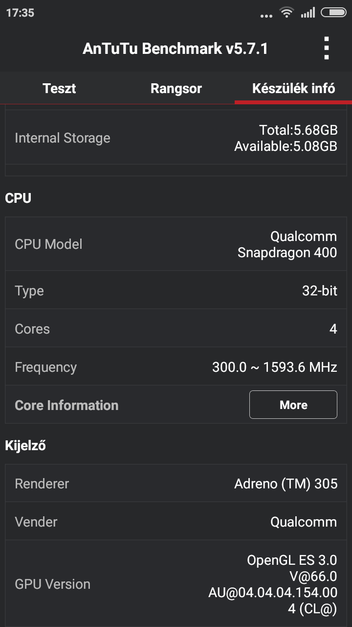 Processzor: Qualcomm MSM8928 Snapdragon 400 Quad-Core 1,6 GHz Cortex-A7 – Adreno 305