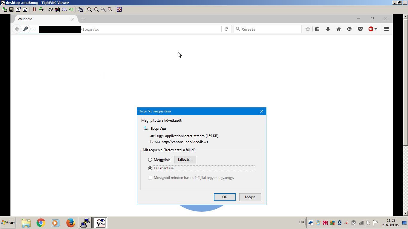 Ezek valószínűleg feltört szerverek, rajtuk keresztül nem lehet eljutni a vírus készítőihez, botnetek segítségével bármikor bővíthetik a hálózatot. A gépet ezután újraindítottam, újraindítás után a dropper már nem indult el automatikusan. Következő lépésben kíváncsi voltam, hogy mit is akart letölteni a JavaScript, ezért kiengedtem a gépet az internetre. Böngészőbe beírtam a naplóban talált URL-ek egyikét, de már nem volt elérhető. Egy még élő URL beírása után viszont a böngésző azonnal le is töltött egy kis méretű, véletlenszerű karakterekből álló nevű állományt, ami a vírustörzs.