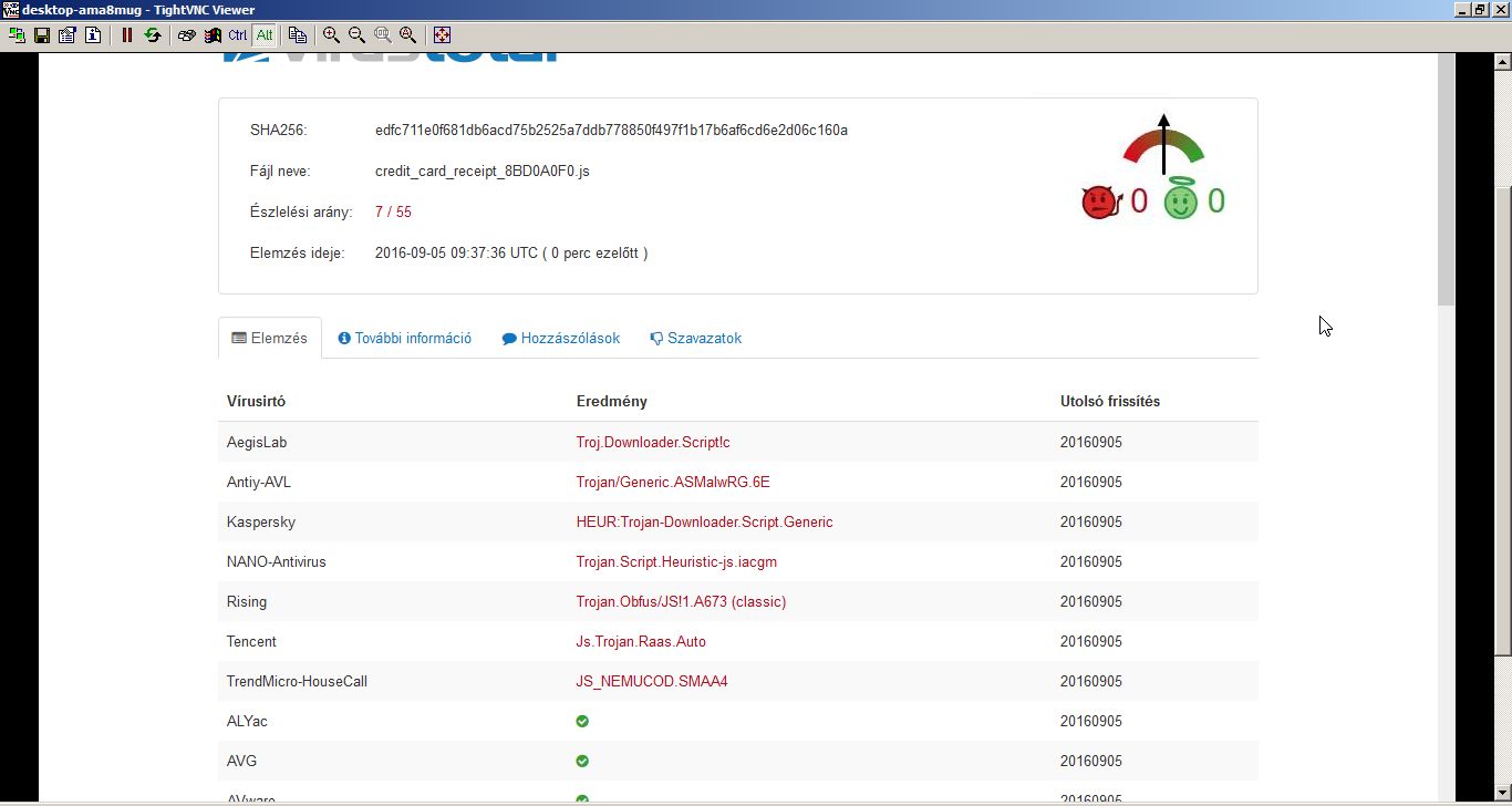 A virustotal.com a törzsre még szomorúbb eredményt mutatott, egy vírusirtó sem találta gyanúsnak: