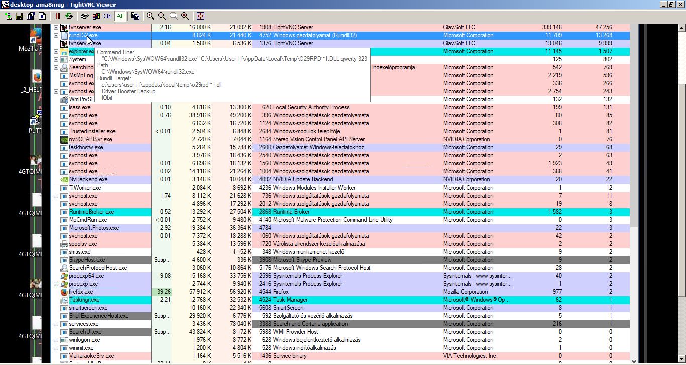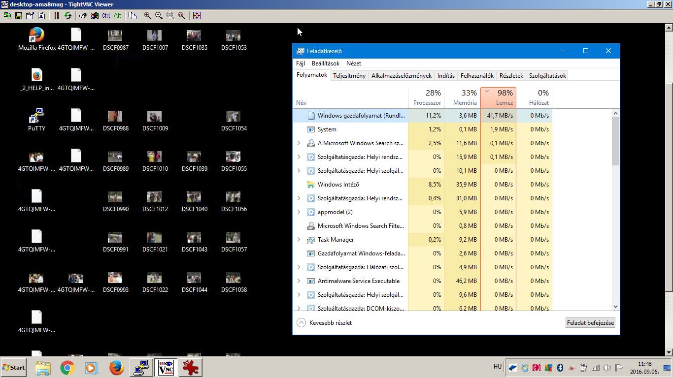 Következő lépésben lefuttattam a JavaScriptet, amely azonnal működésbe is lépett, letöltötte a vírustörzset, majd elkezdte titkosítani az adatainkat. Feladatkezelővel és Process Explorerrel nézve a futó folyamatokat látszik, hogy dolgozik a kártevő, a merevlemez 100%-os kihasználtsággal működik. Ha éppen egy mappában járunk, és hirtelen azt látjuk, hogy furcsa, véletleszerű karakterek jelennek a filenevek helyén, azonnal kapcsoljuk ki a gépet (akár áramtalanítással), bár már valószínűleg késő! Én 7GB-nyi képet helyeztem el csalinak a gépen, ezt 15 perc alatt titkosította le egy 10 éves számítógép.